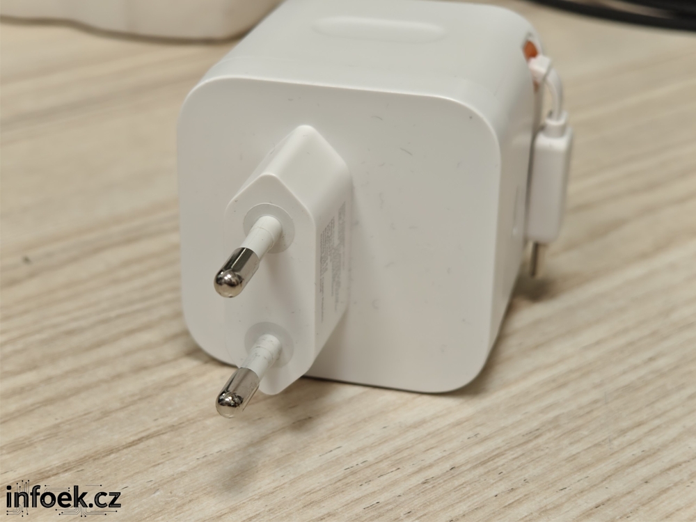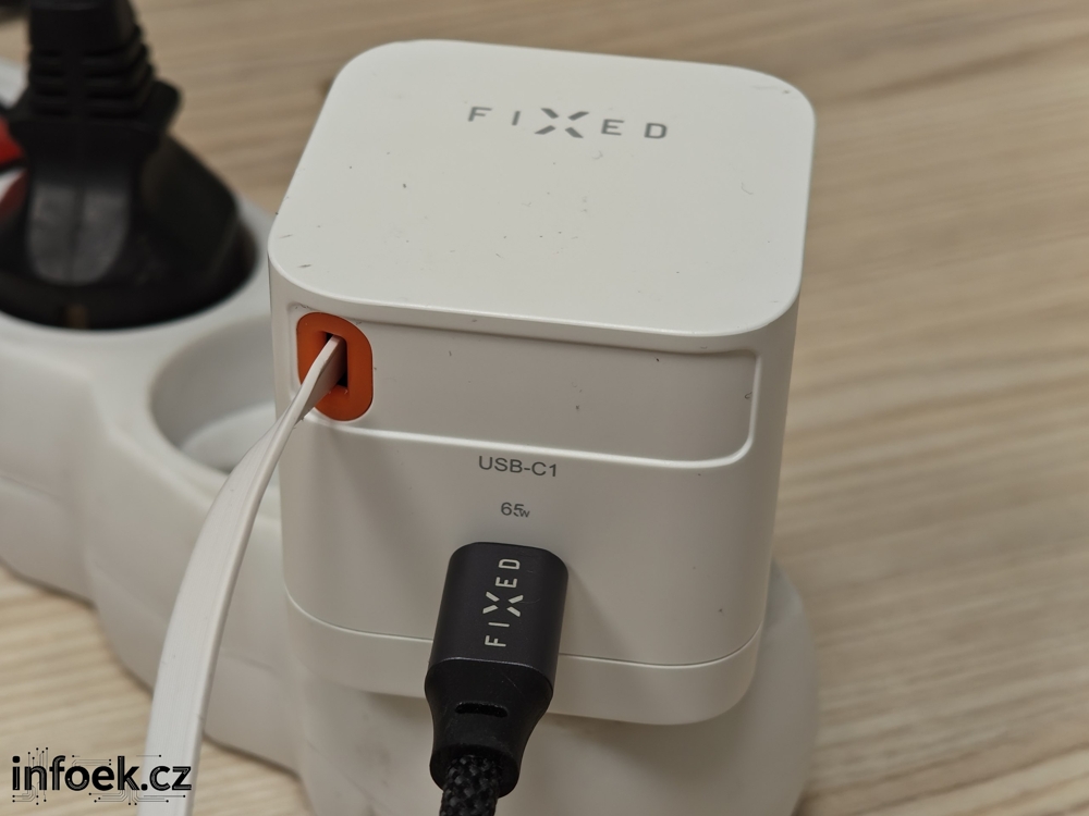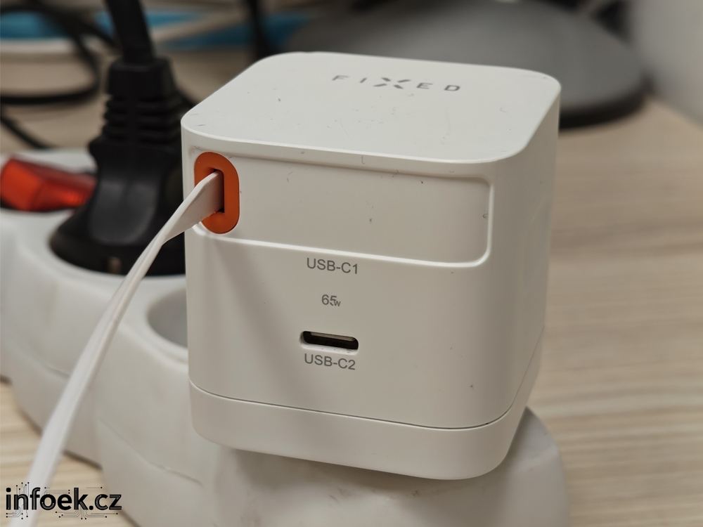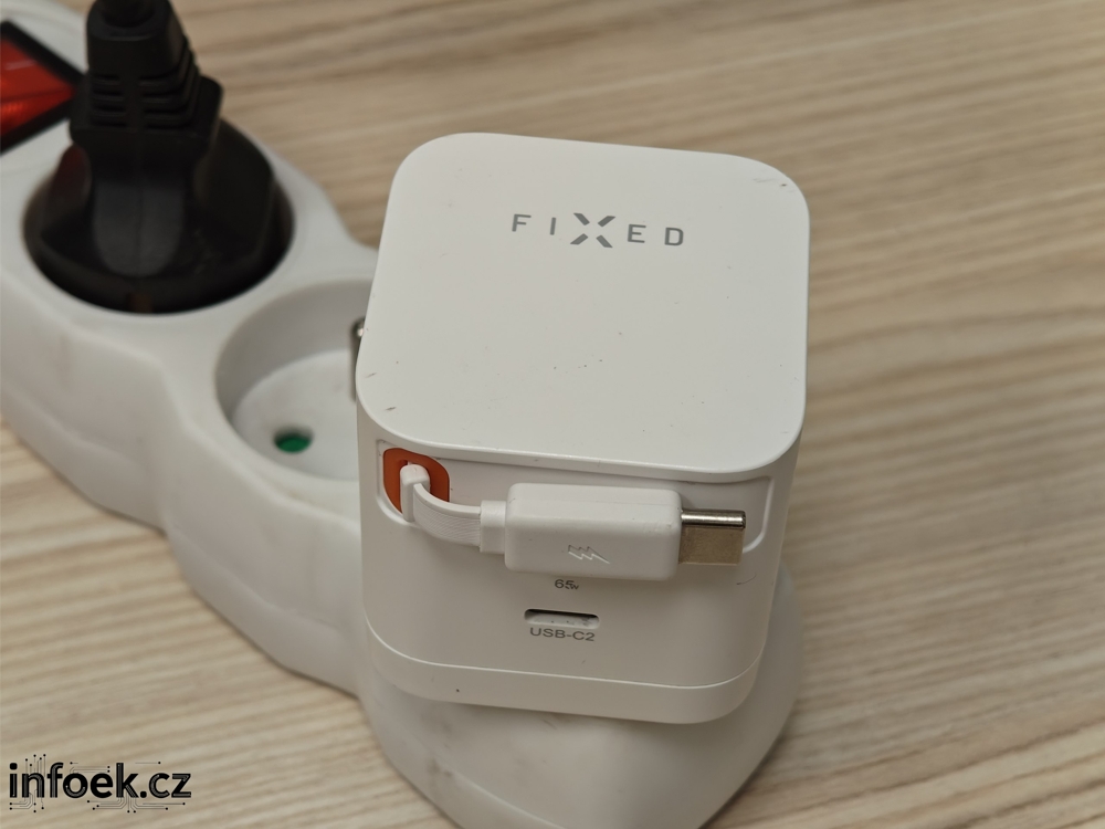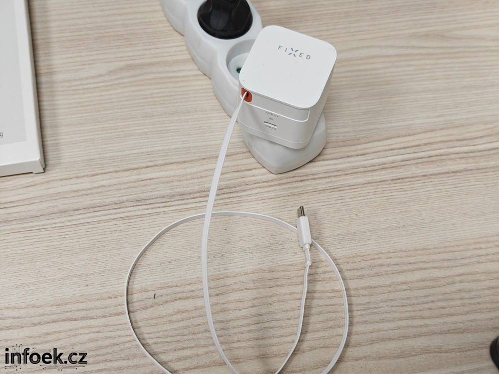 Na horní části adaptéru se nachází logo značky FIXED. Na boku je konec kabelu s konektorem USB‑C, v němž je ukryt magnet, který brání samovolnému odvíjení kabelu při přenášení. Integrovaný kabel má délku 64 cm. To mi většinou stačilo, ale občas bych ocenil spíše délku kolem 100 cm. V takových případech jsem připojil magnetický kabel FIXED a bez potíží nabíjel dvě zařízení najednou.