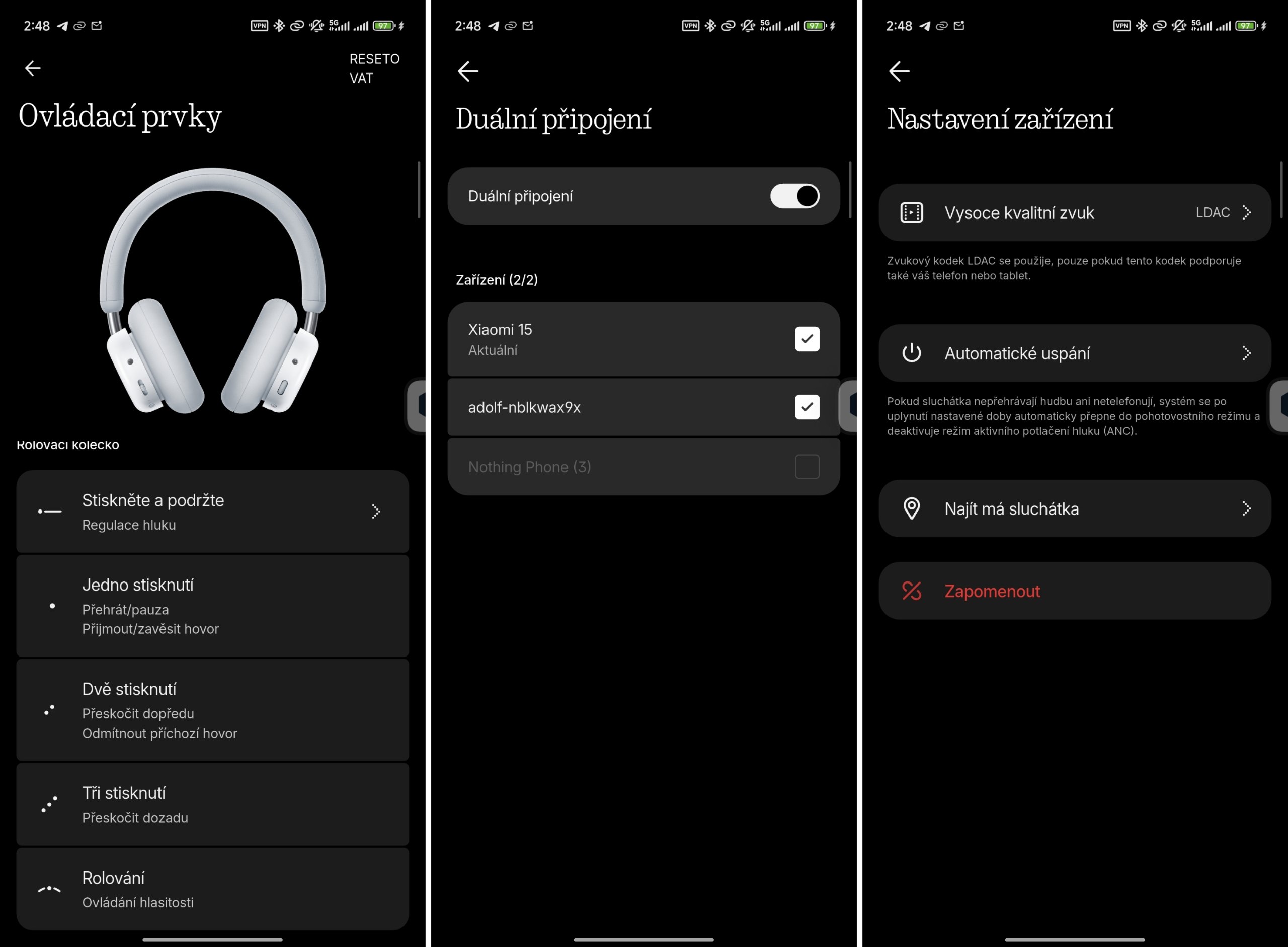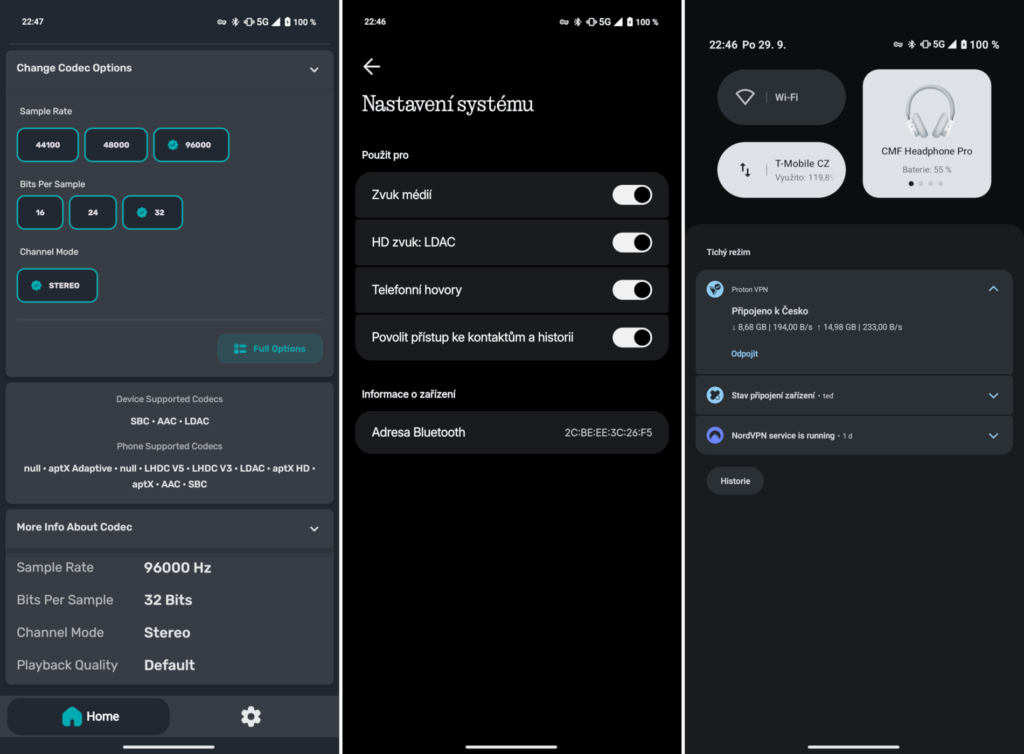 Bezdrátově lze sluchátka používat téměř s každým moderním zařízením. Výrobce zaslouží pochvalu za podporu vysoce kvalitního kodeku LDAC, který není omezen pouze na značku výrobce. Používal jsem jej na mobilu Nothing Phone (3), bez problémů mi fungoval také s Xiaomi 15 a notebookem s linuxovou distribucí. LDAC u tohoto modelu sluchátek umožňuje vzorkovací frekvenci až 96 kHz se 32 bity, což je velmi vysoký parametr. Samozřejmostí je podpora kodeků AAC a SBC. Někoho může zamrzet absence kodeku AptX Adaptive.