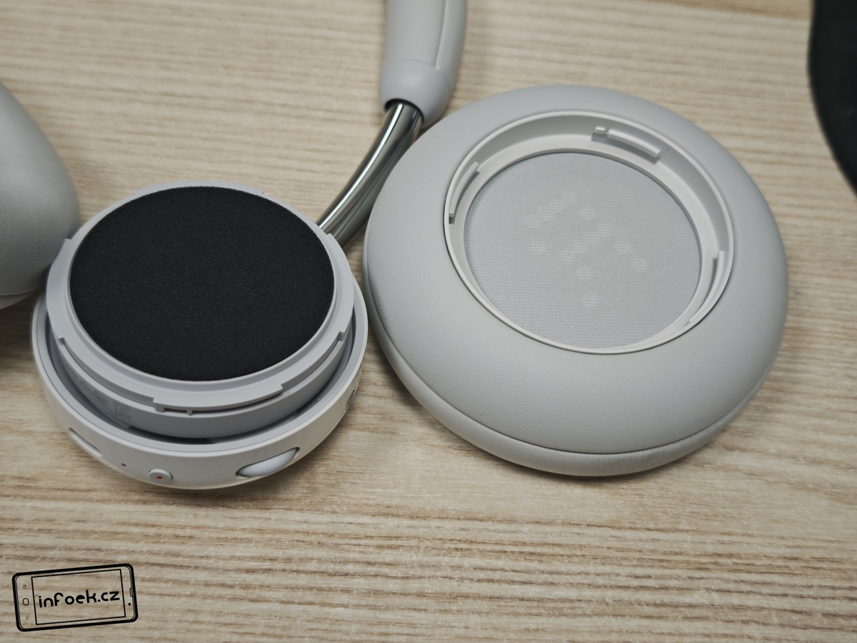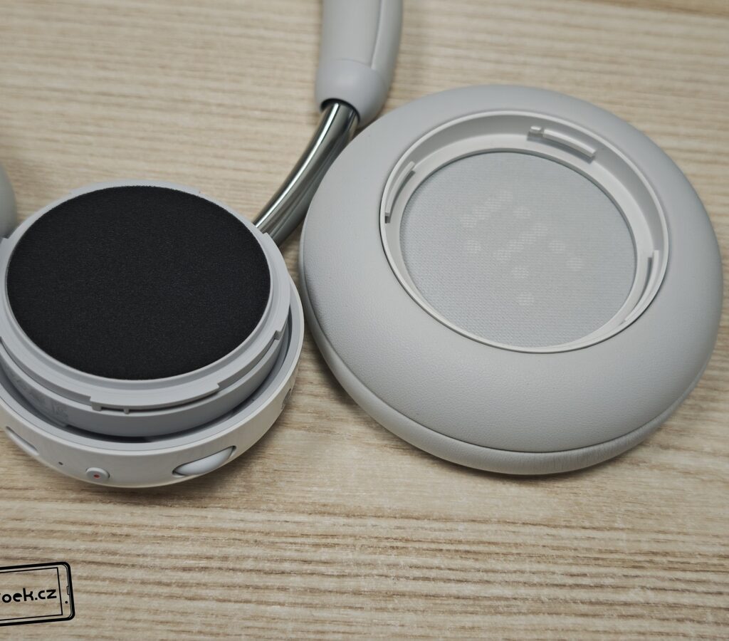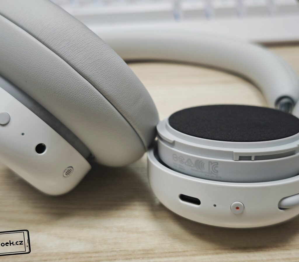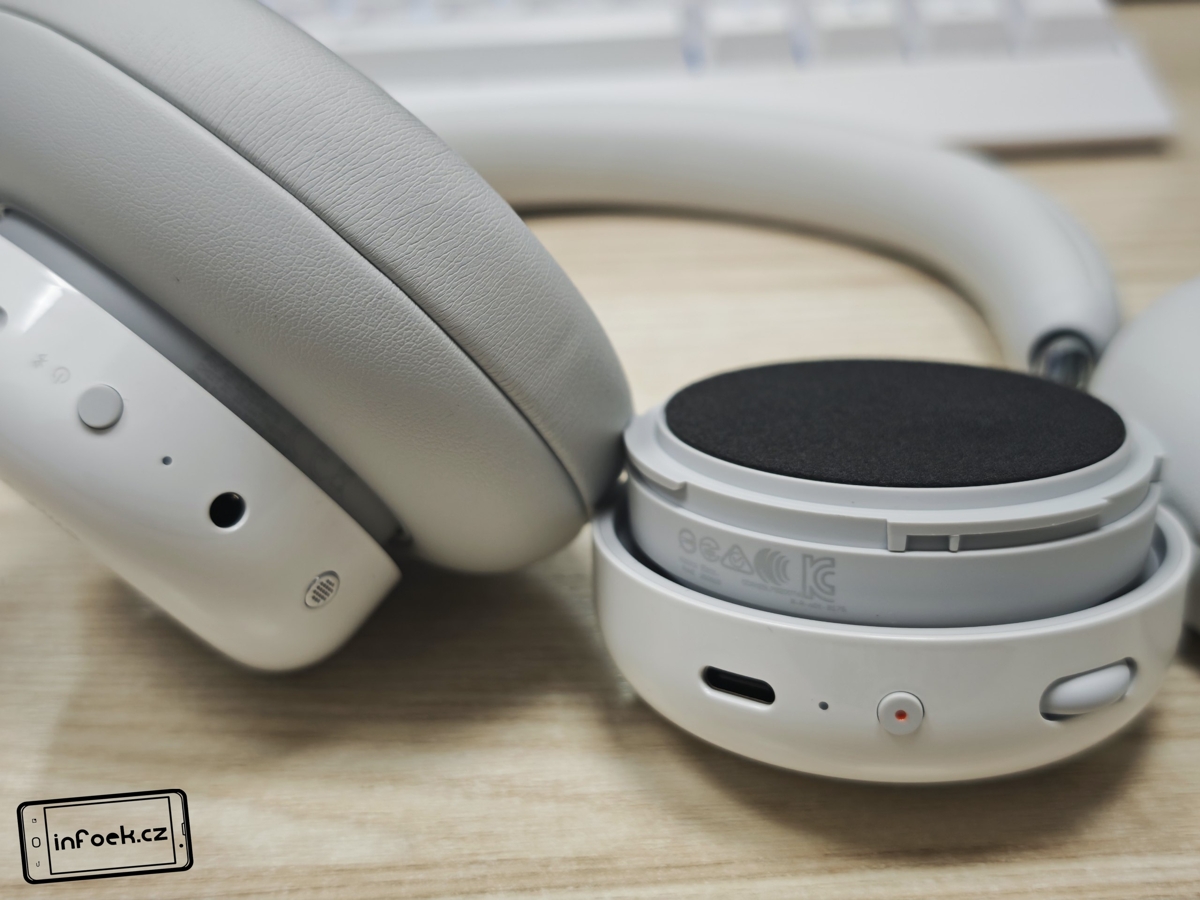 Vnější část sluchátek tvoří plastové části oblých tvarů. Plast je pevný, nepovrzává a já osobně jsem rád, že sluchátka nenabízí dotykové ovládání gesty. Nemám je totiž příliš v oblibě, proto oceňuji hardwarová ovládací tlačítka. Na sluchátkách jsou důležité mikrofony, USB-C konektor pro nabíjení, 3,5 mm audio jack, červené tlačítko s více funkcemi a ještě dvě zajímavá „tlačítka“. Jedno připomíná kolečko od počítačové myši – můžete jím otáčet do stran nebo ho stisknout. Dále je k dispozici polohovatelný posuvník. K jejich funkcím se ještě později vrátím.