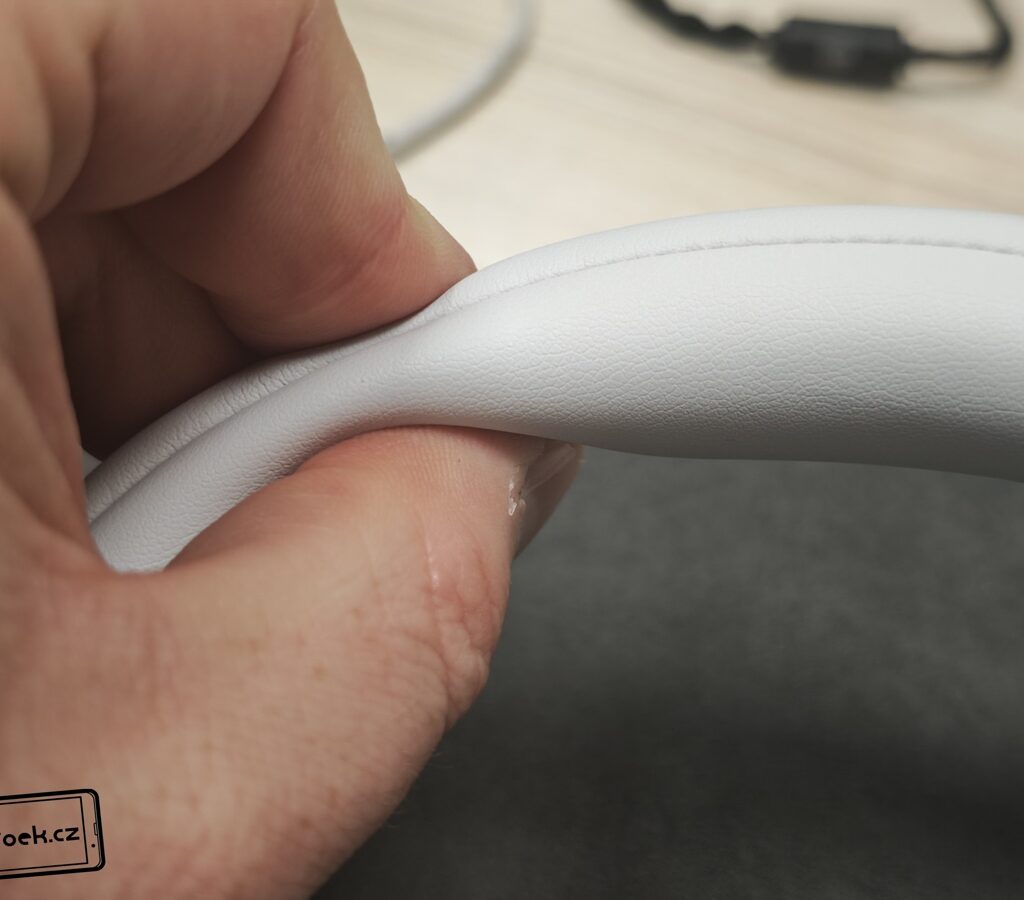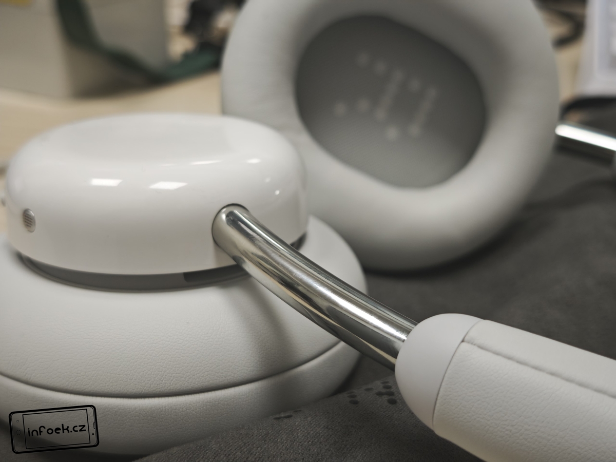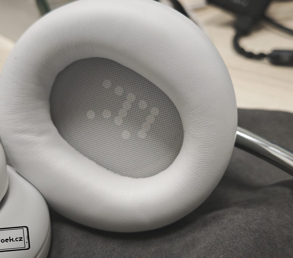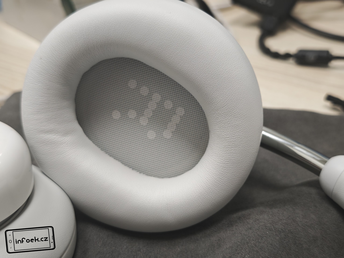 Vnější část sluchátek tvoří plastové části oblých tvarů. Plast je pevný, nepovrzává a já osobně jsem rád, že sluchátka nenabízí dotykové ovládání gesty. Nemám je totiž příliš v oblibě, proto oceňuji hardwarová ovládací tlačítka. Na sluchátkách jsou důležité mikrofony, USB-C konektor pro nabíjení, 3,5 mm audio jack, červené tlačítko s více funkcemi a ještě dvě zajímavá „tlačítka“. Jedno připomíná kolečko od počítačové myši – můžete jím otáčet do stran nebo ho stisknout. Dále je k dispozici polohovatelný posuvník. K jejich funkcím se ještě později vrátím.