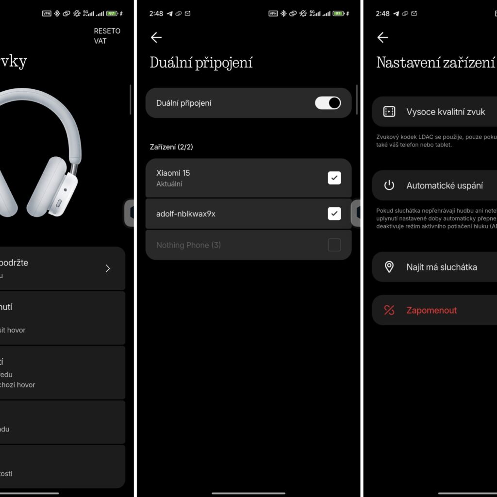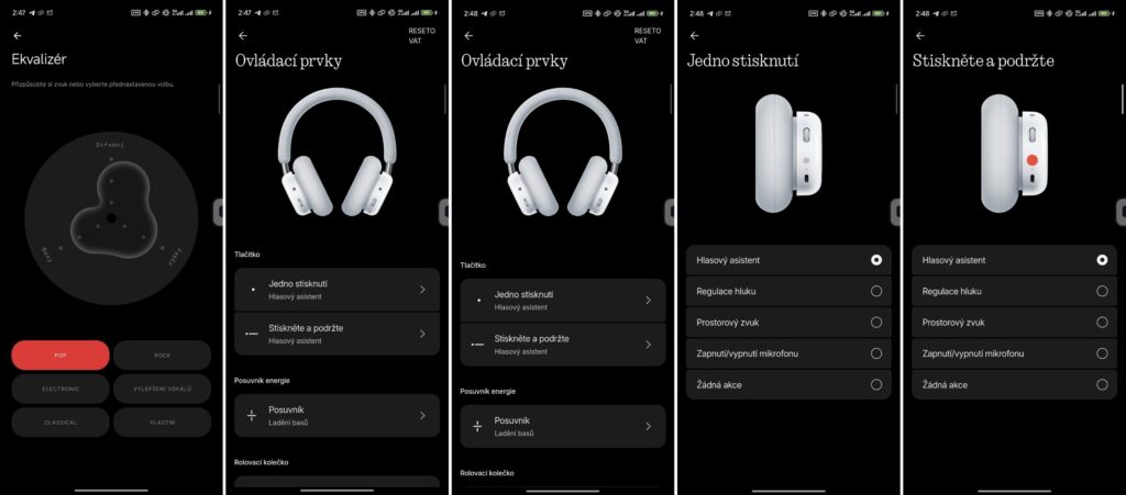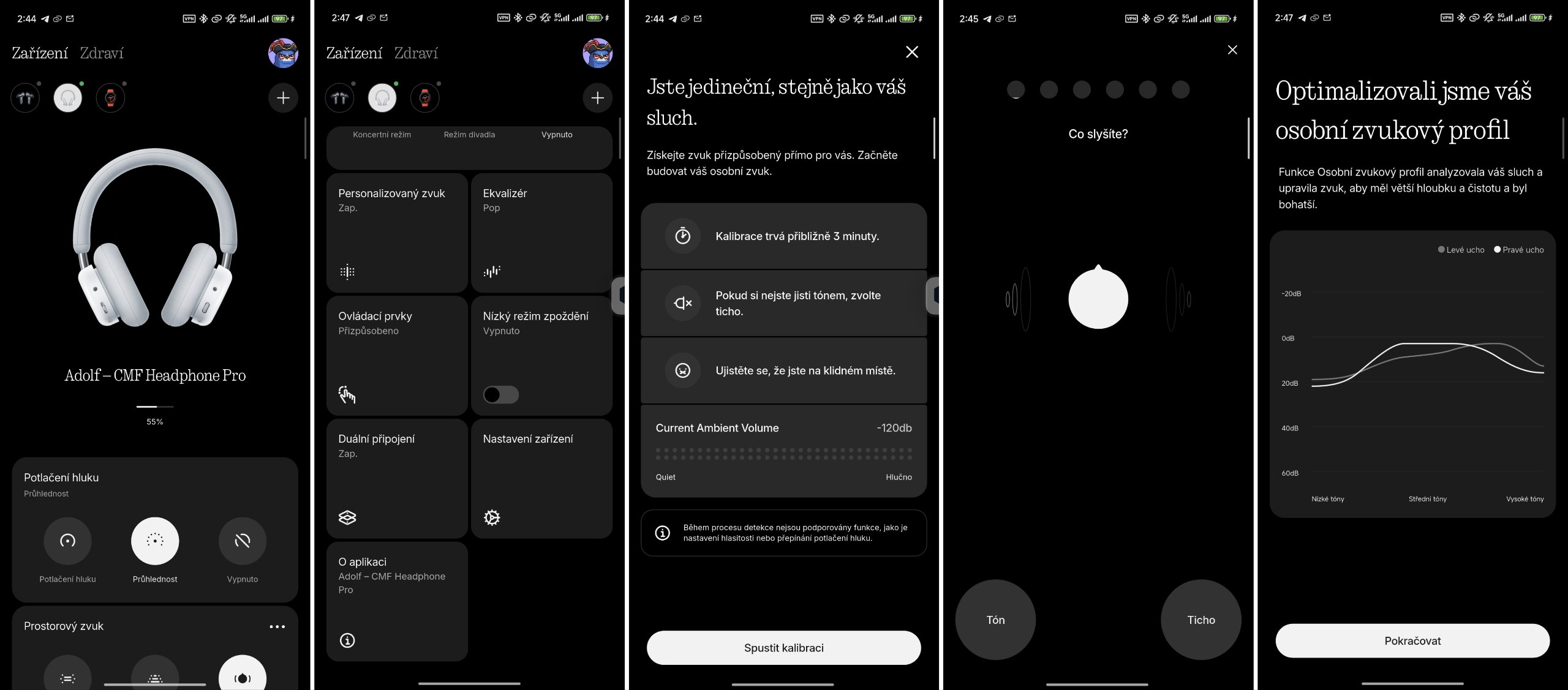 Hned po spuštění vidíte stav nabití sluchátek, můžete přepínat mezi ANC a transparentním režimem, regulovat sílu těchto režimů a zapnout prostorový zvuk. Pochválit musím personalizovaný zvuk, který nastavení přizpůsobí vašim uším pro ideální zvukové podání. K dispozici je také pěkný ekvalizér, možnost nastavovat duální připojení ke dvěma zařízením současně, vybrat kodek, nastavit časovač automatického vypnutí sluchátek a podrobně nastavit funkce fyzických tlačítek.