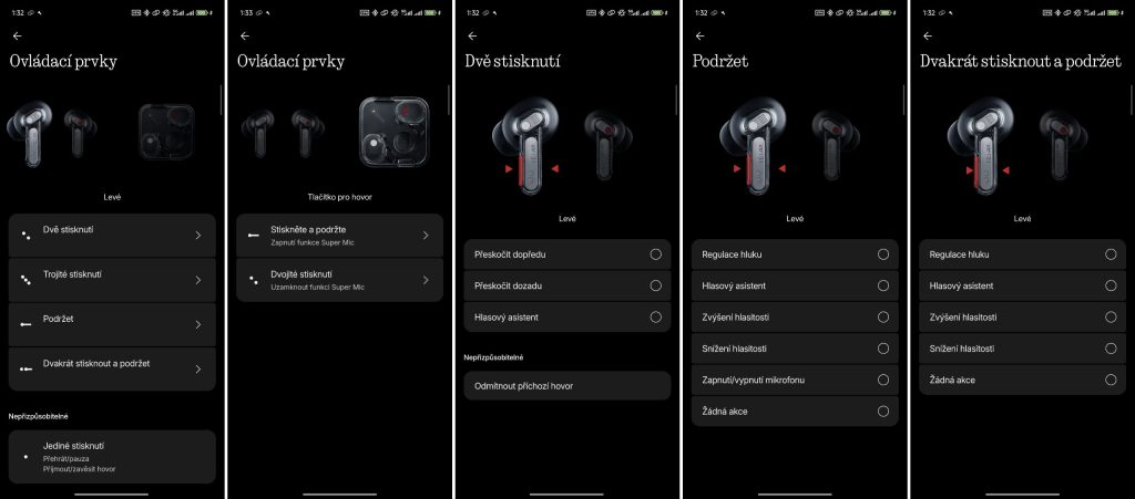 Na každém sluchátku se nachází mikrofon pro kvalitní hovory i další režimy. Využíval jsem je denně pro telefonní hovory přes aplikaci Telegram a byl jsem s jejich kvalitou spokojený. Mikrofony ovšem slouží také pro aktivní potlačení hluku (ANC). Uživatel si může vybrat mezi několika úrovněmi regulace okolního hluku, spolehnout se na adaptivní režim podle prostředí, nebo funkci zcela vypnout. Při jízdě na elektrické koloběžce nebo chůzi po ulici je naopak praktické zapnout režim „Průhlednost“. Mikrofony v tomto režimu propouštějí okolní zvuky, takže slyšíte například projíždějící vozidla, a přitom dál posloucháte hudbu. Tuto funkci jsem využíval denně a byl jsem s ní maximálně spokojený.