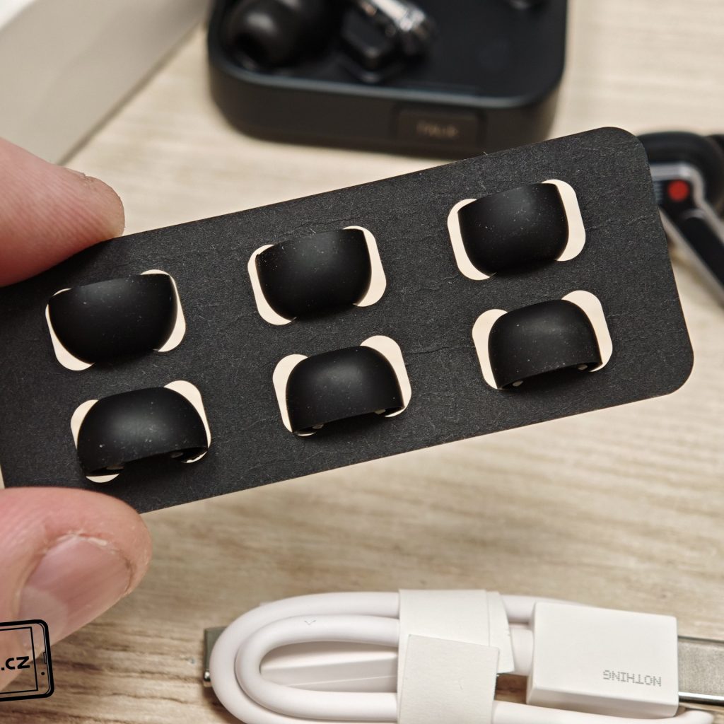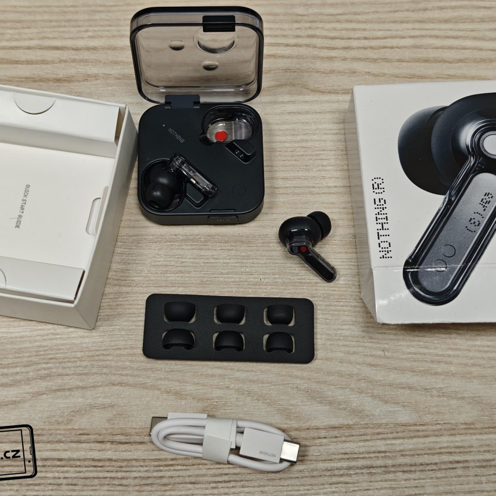 Sluchátka se prodávají v malé krabičce. Ta obsahuje nabíjecí pouzdro s dvojicí sluchátek, krátký nabíjecí kabel USB-C na USB-C a různé velikosti gumových špuntů. Nic podstatného tedy nechybí.