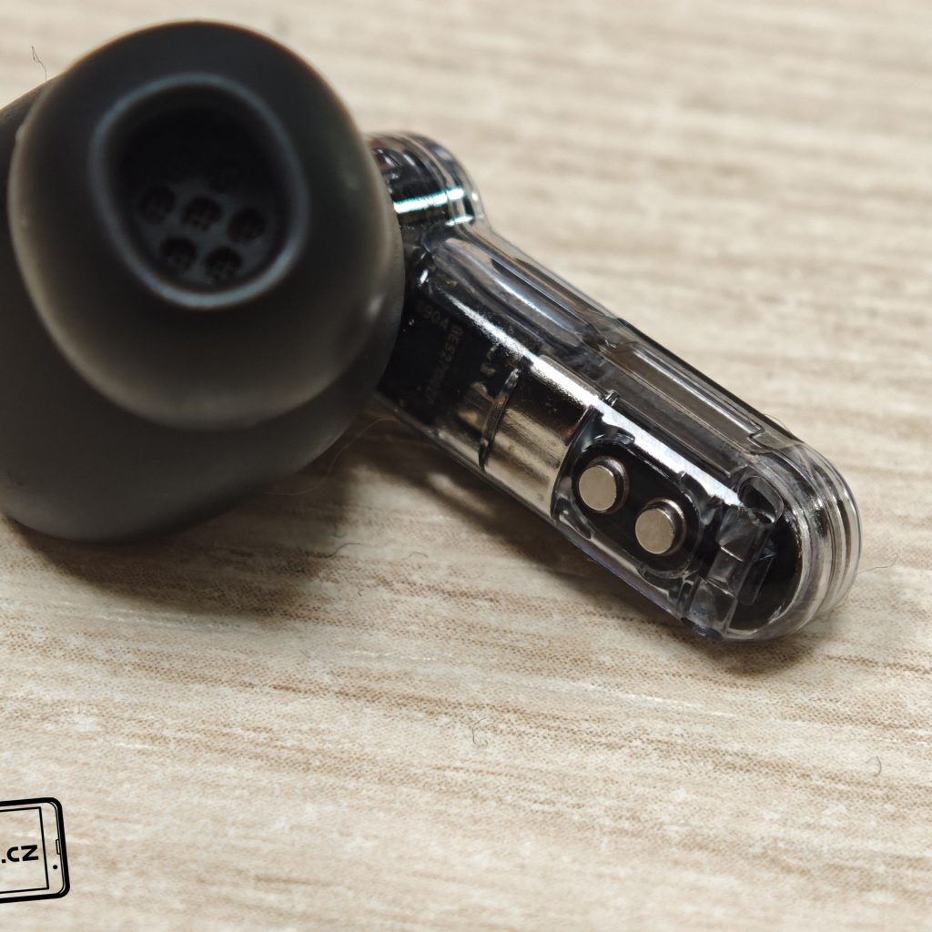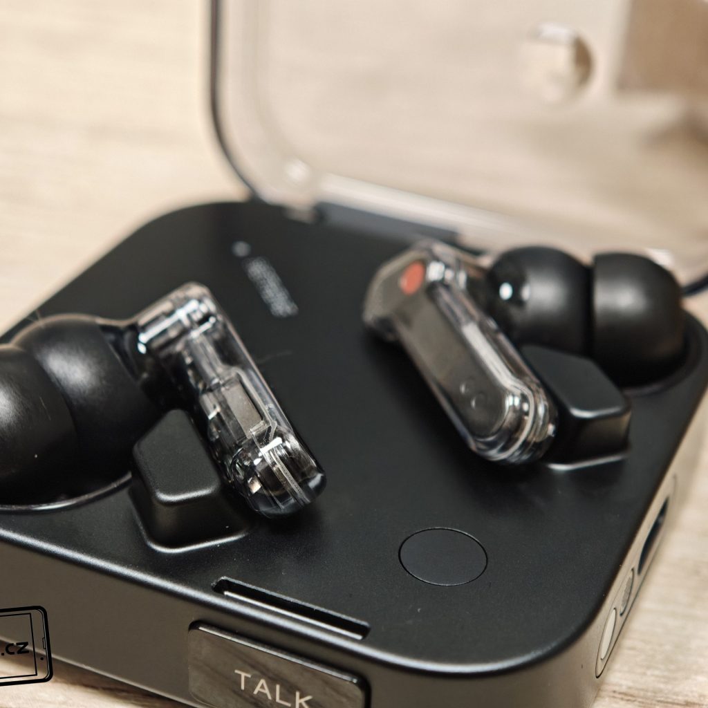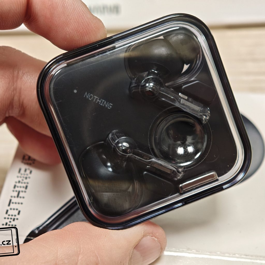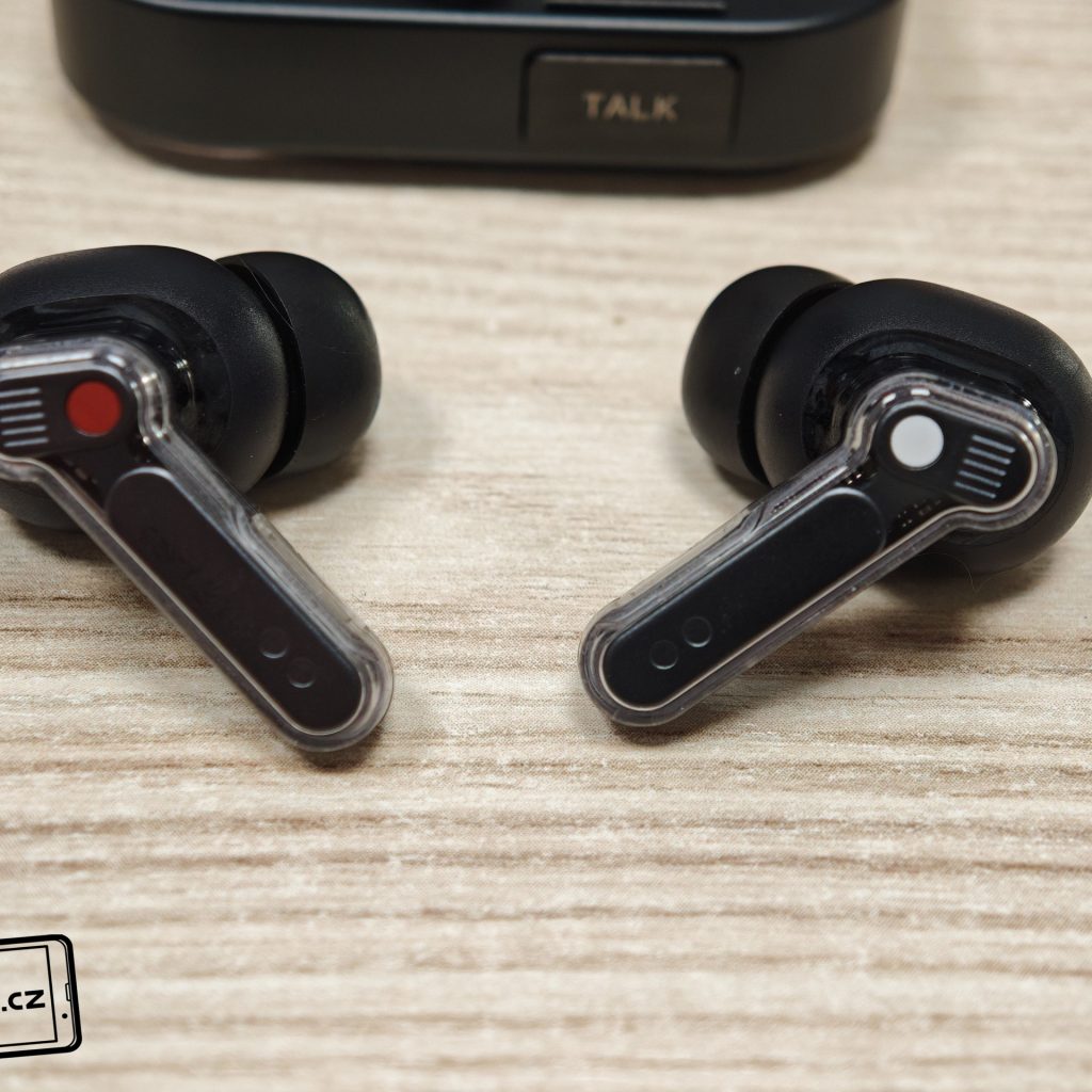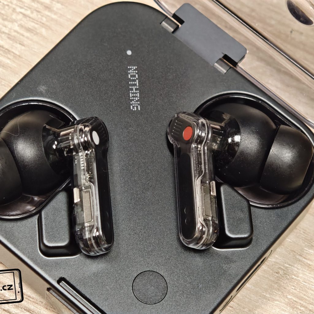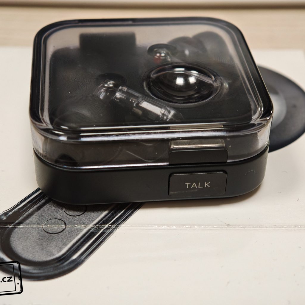 Sluchátka jsou k dispozici v bílém a černém barevném provedení. Já testoval černou verzi, přičemž v obou případech má horní plastové víko nabíjecího pouzdra průhledné provedení. Ve víku je prohlubeň pro pohodlnější držení. Další průhledné části najdeme po vyjmutí sluchátek. Uvnitř krabičky je modelové označení, barevná dioda, nabíjecí piny, magnetické uchycení sluchátek a fyzické tlačítko pro párování či reset. Pochválit musím i umístění sluchátek uvnitř krabičky – díky dostatečným mezerám je vyjmutí pohodlné i při chůzi.
