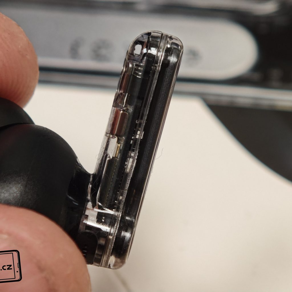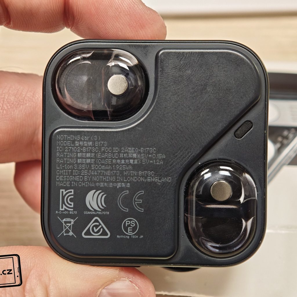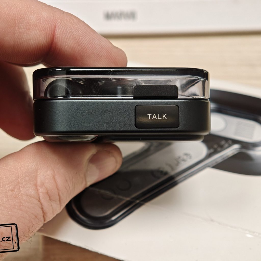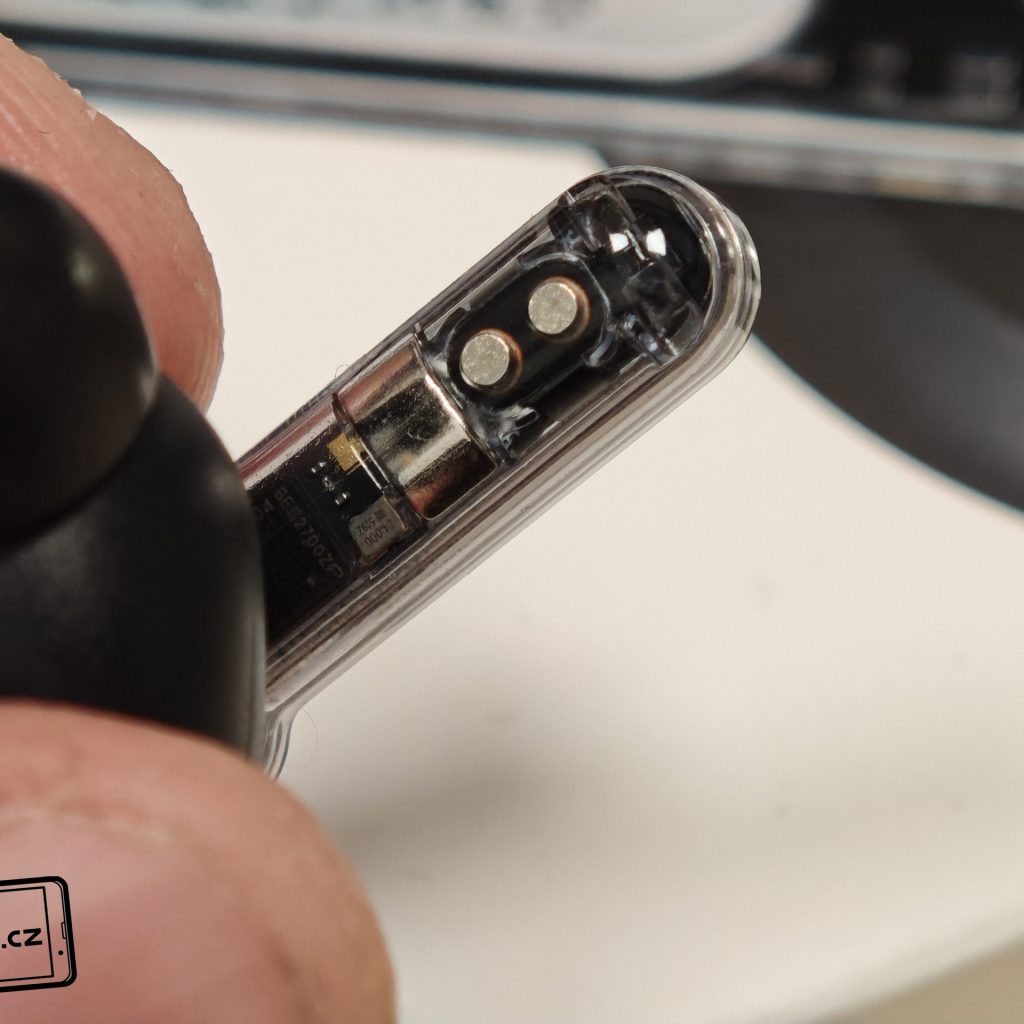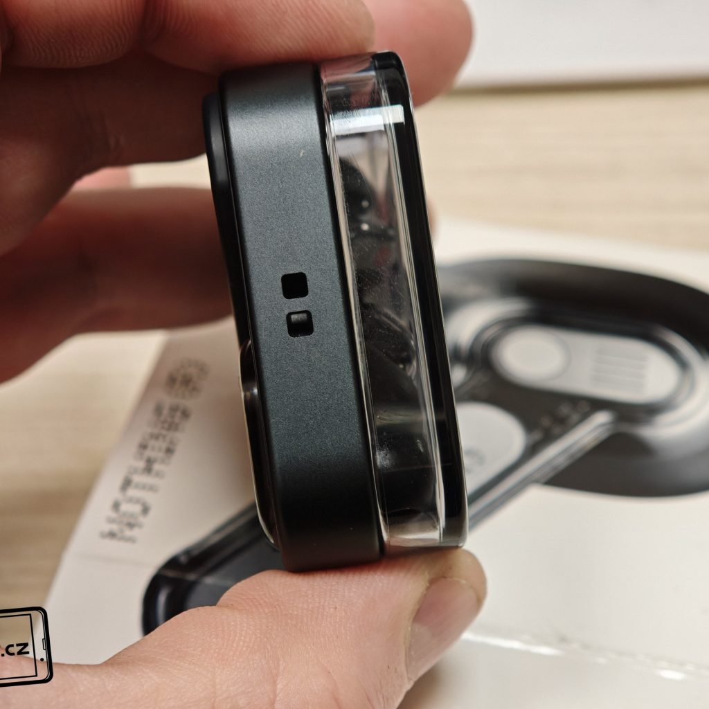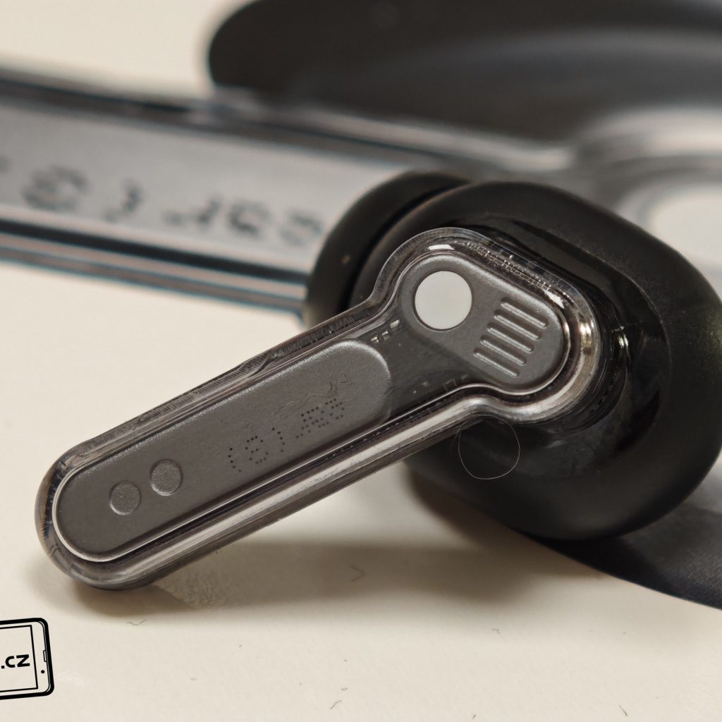 Sluchátka jsou k dispozici v bílém a černém barevném provedení. Já testoval černou verzi, přičemž v obou případech má horní plastové víko nabíjecího pouzdra průhledné provedení. Ve víku je prohlubeň pro pohodlnější držení. Další průhledné části najdeme po vyjmutí sluchátek. Uvnitř krabičky je modelové označení, barevná dioda, nabíjecí piny, magnetické uchycení sluchátek a fyzické tlačítko pro párování či reset. Pochválit musím i umístění sluchátek uvnitř krabičky – díky dostatečným mezerám je vyjmutí pohodlné i při chůzi.