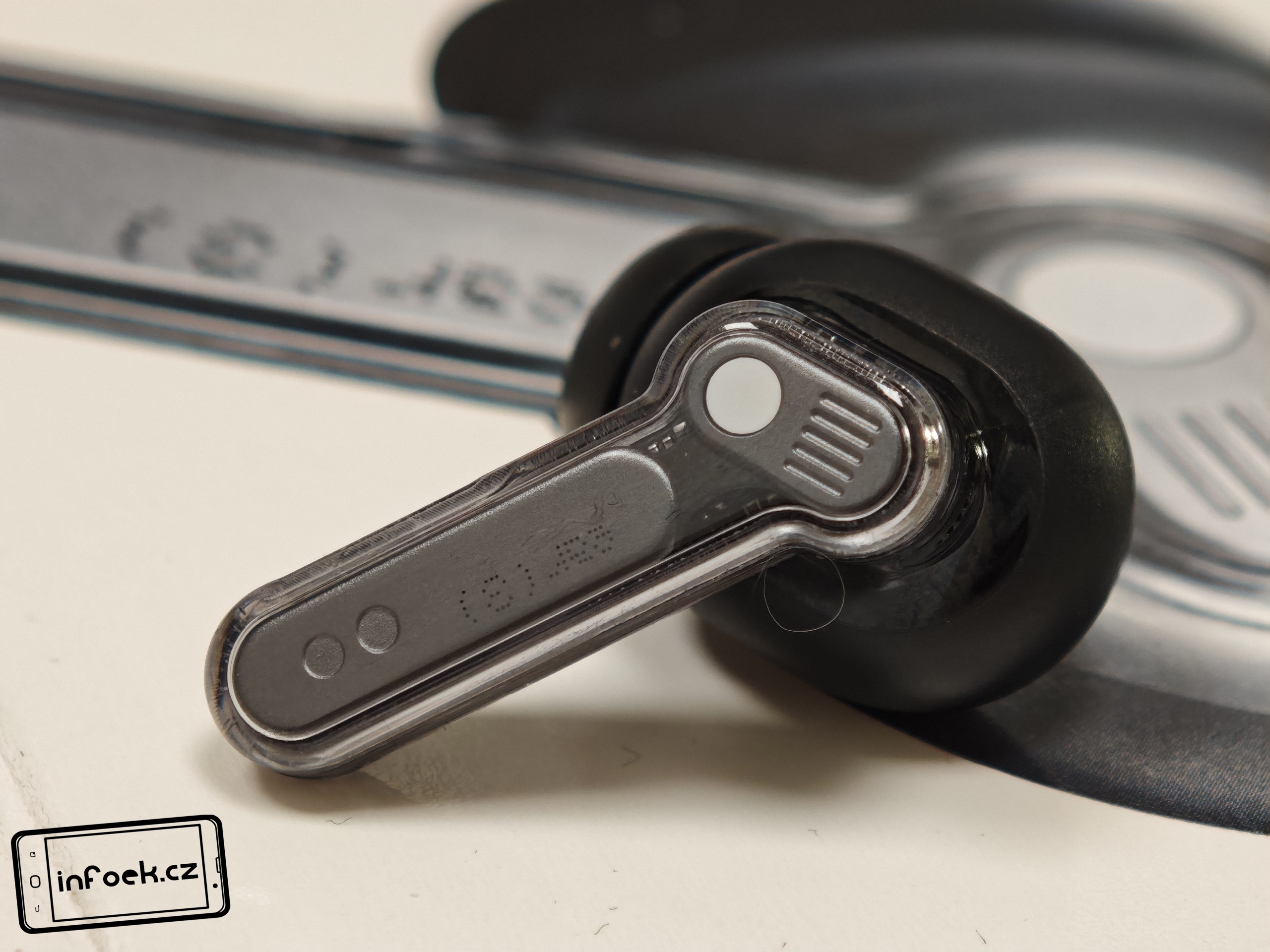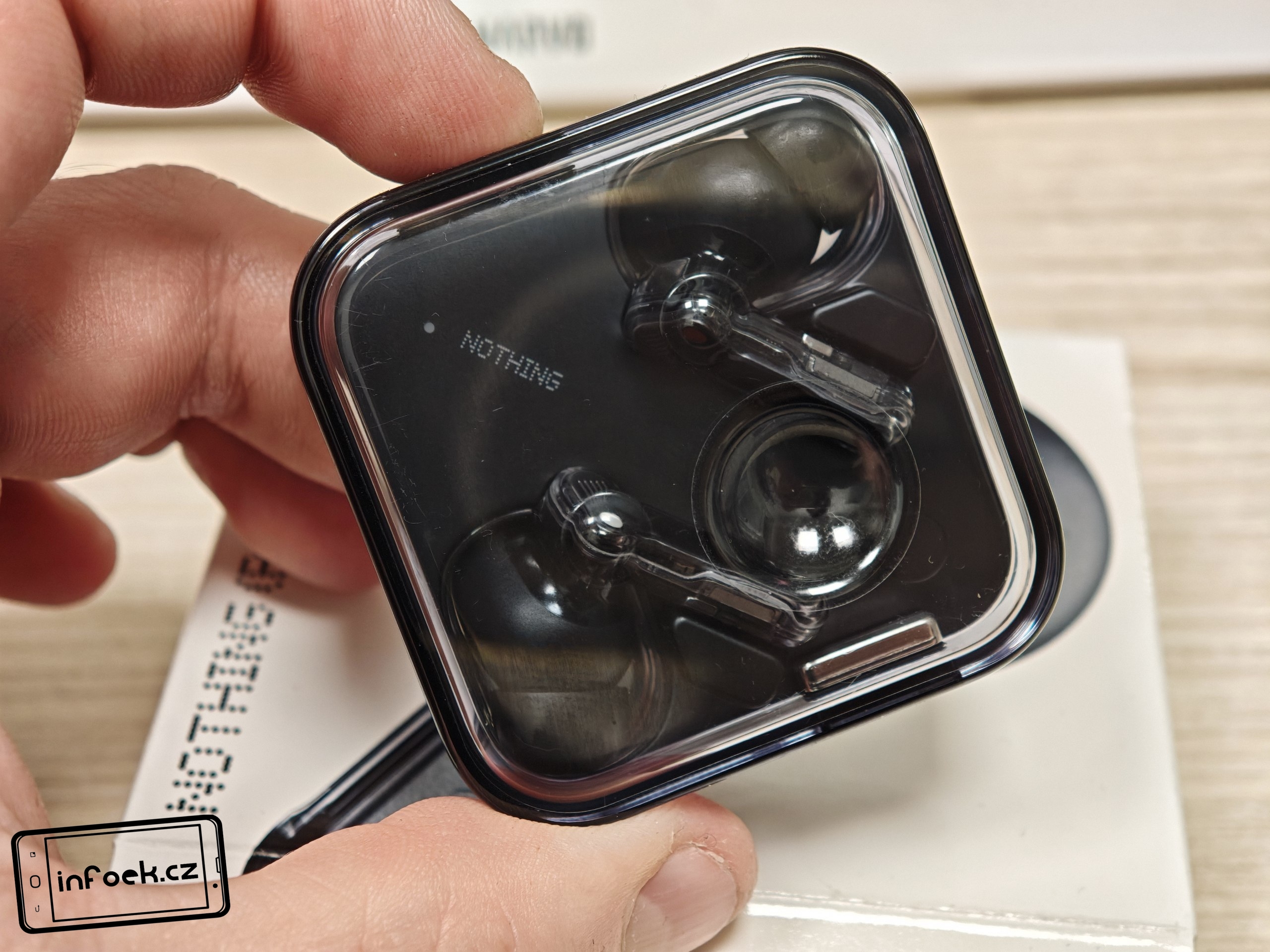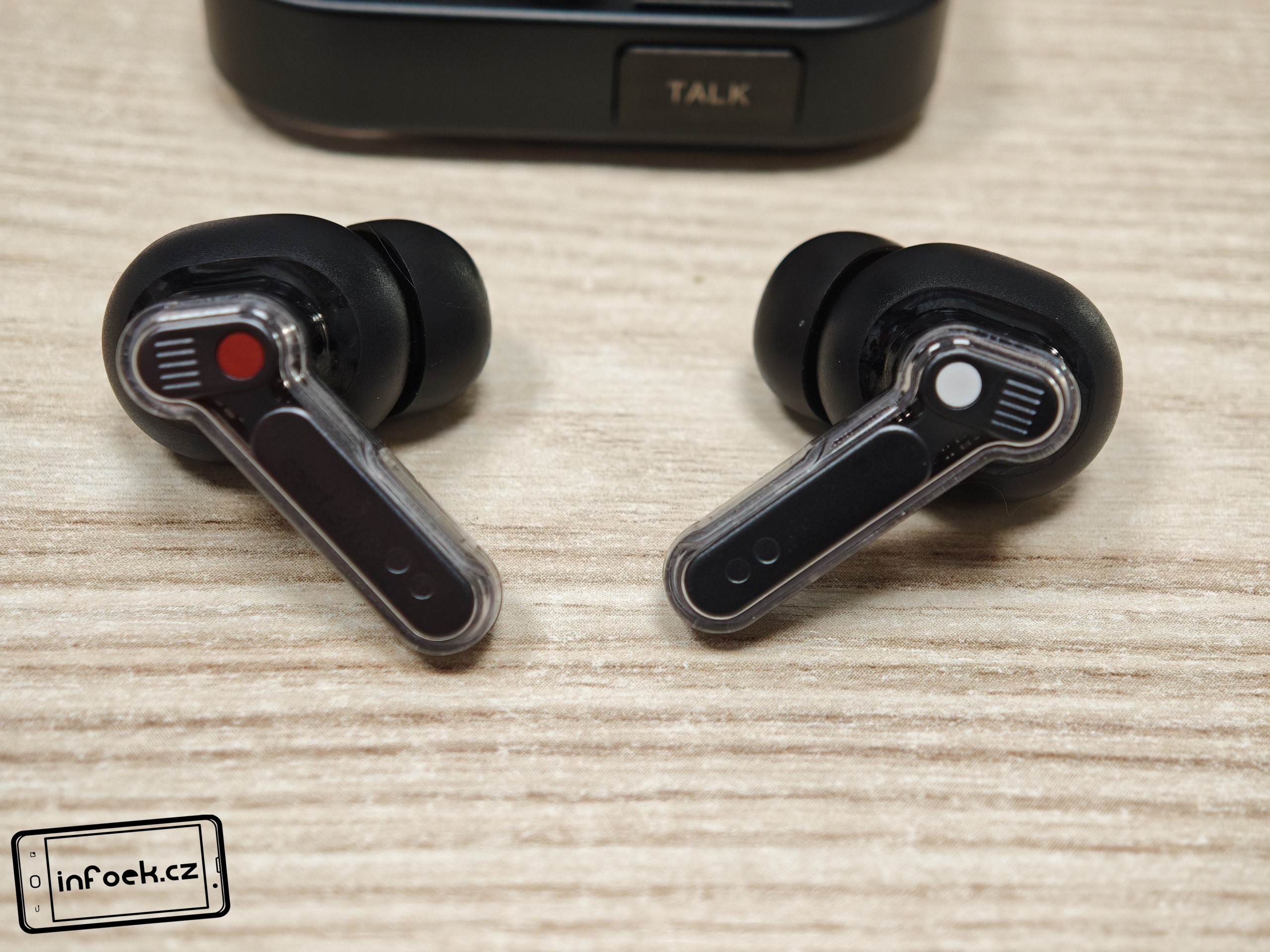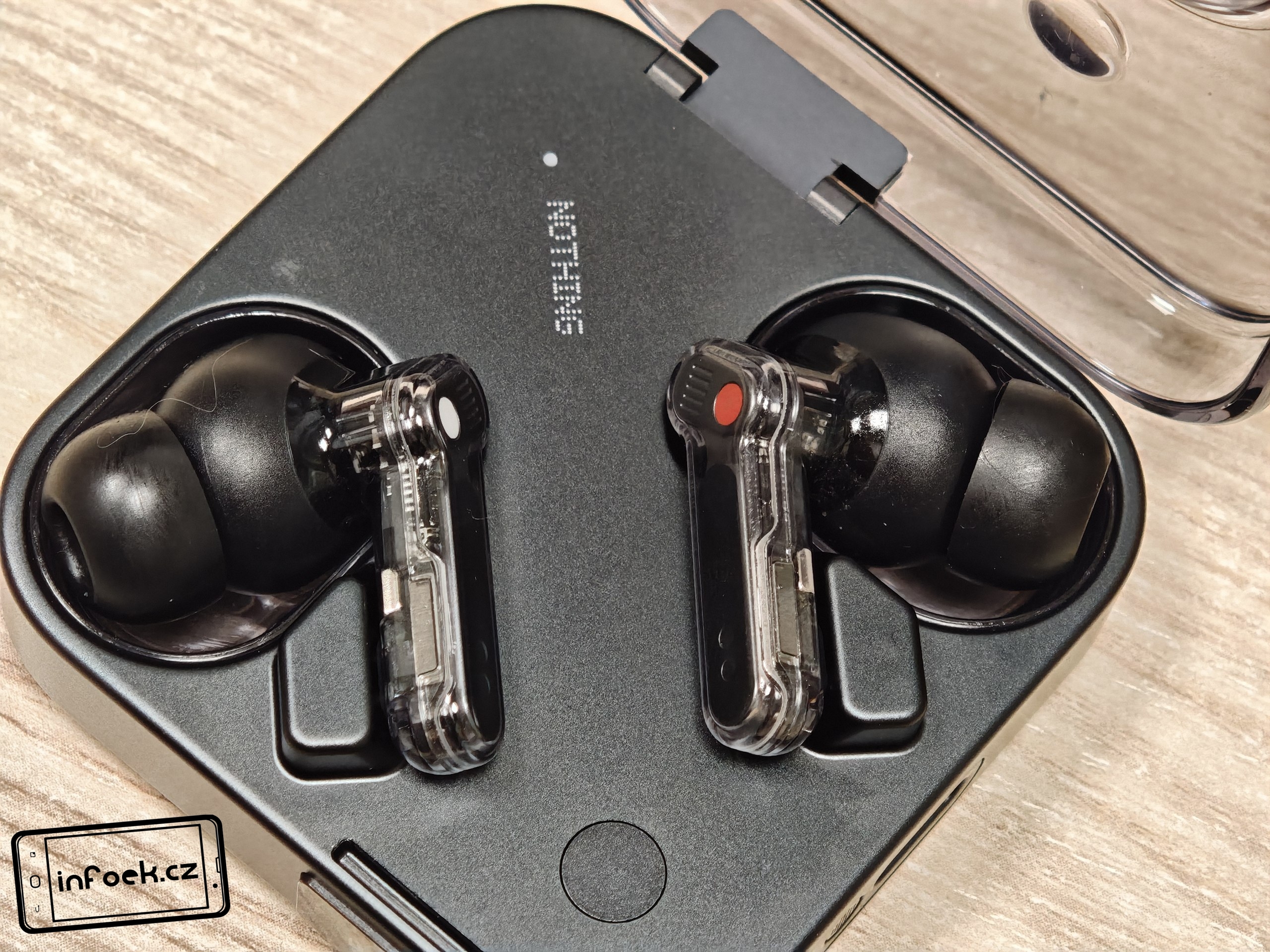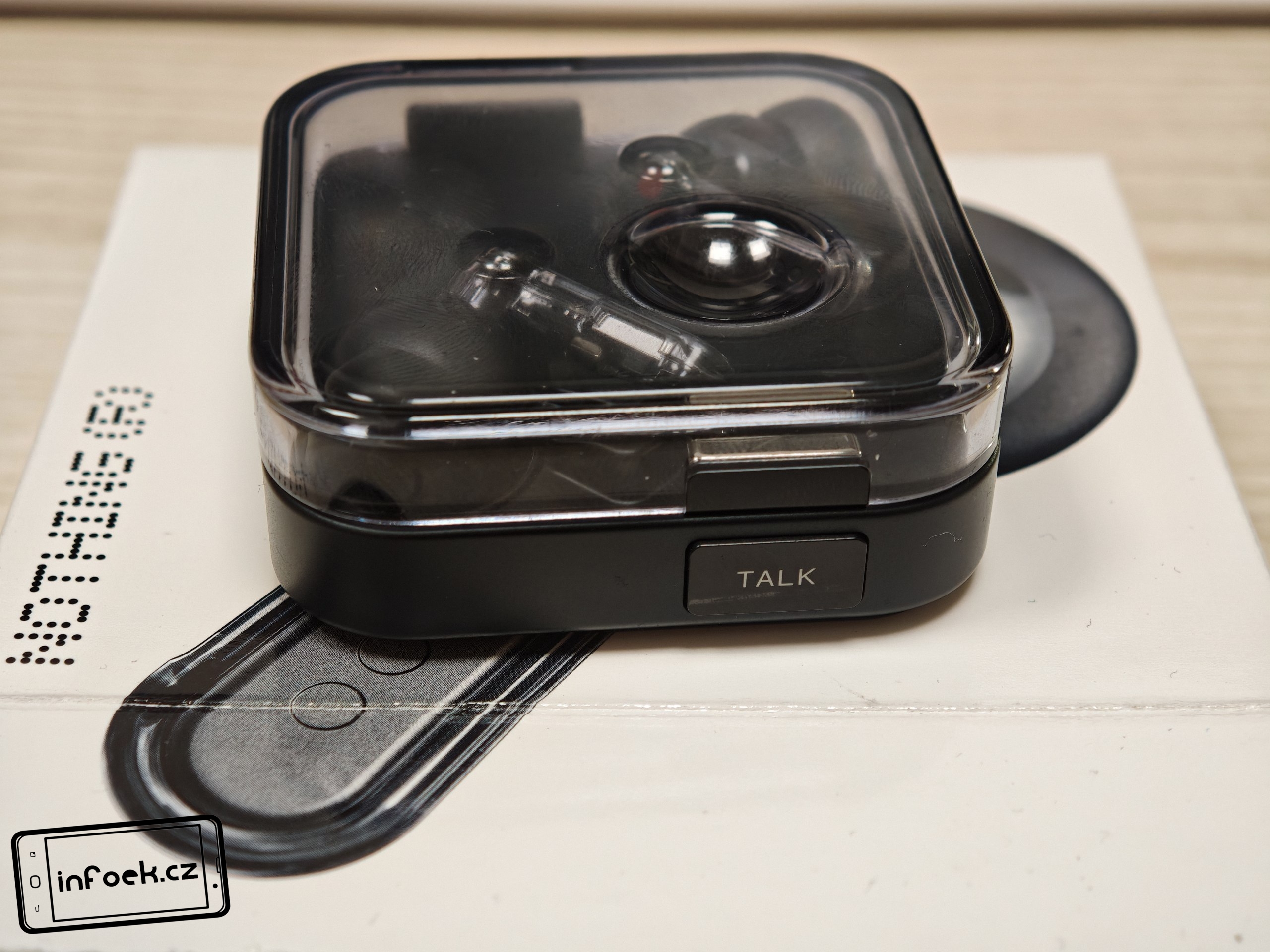 Sluchátka jsou k dispozici v bílém a černém barevném provedení. Já testoval černou verzi, přičemž v obou případech má horní plastové víko nabíjecího pouzdra průhledné provedení. Ve víku je prohlubeň pro pohodlnější držení. Další průhledné části najdeme po vyjmutí sluchátek. Uvnitř krabičky je modelové označení, barevná dioda, nabíjecí piny, magnetické uchycení sluchátek a fyzické tlačítko pro párování či reset. Pochválit musím i umístění sluchátek uvnitř krabičky – díky dostatečným mezerám je vyjmutí pohodlné i při chůzi.