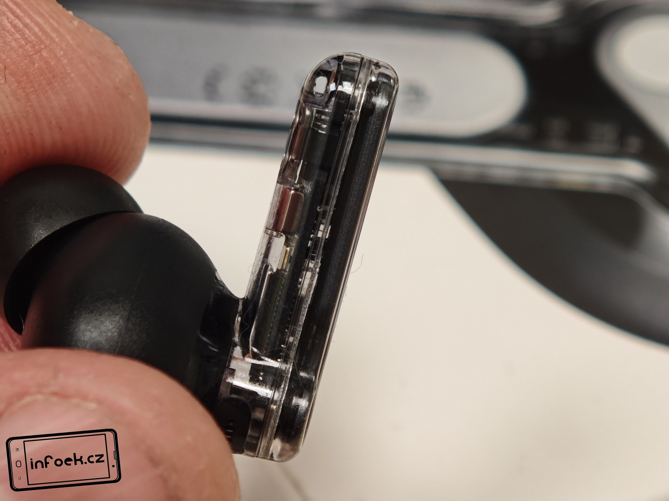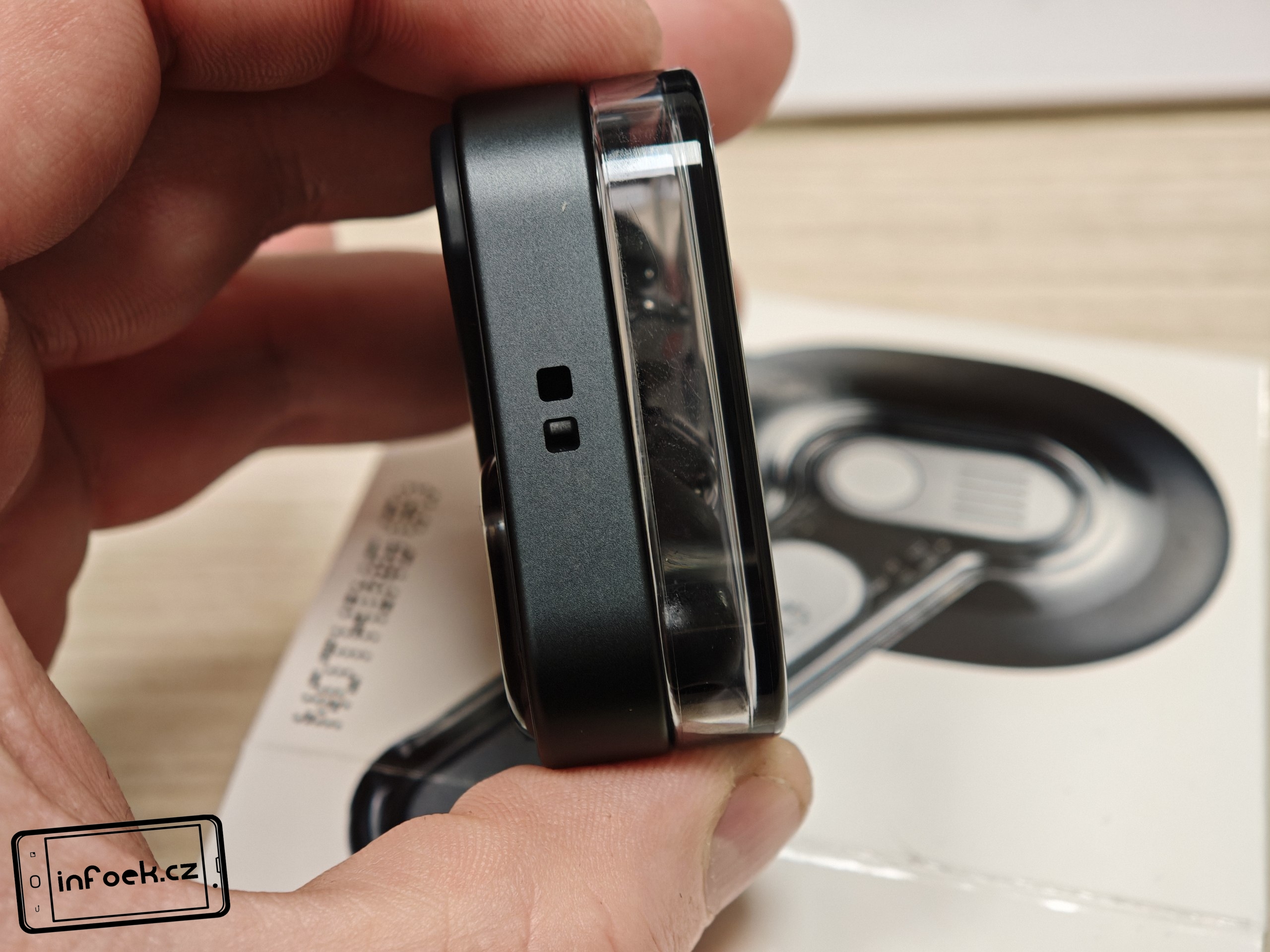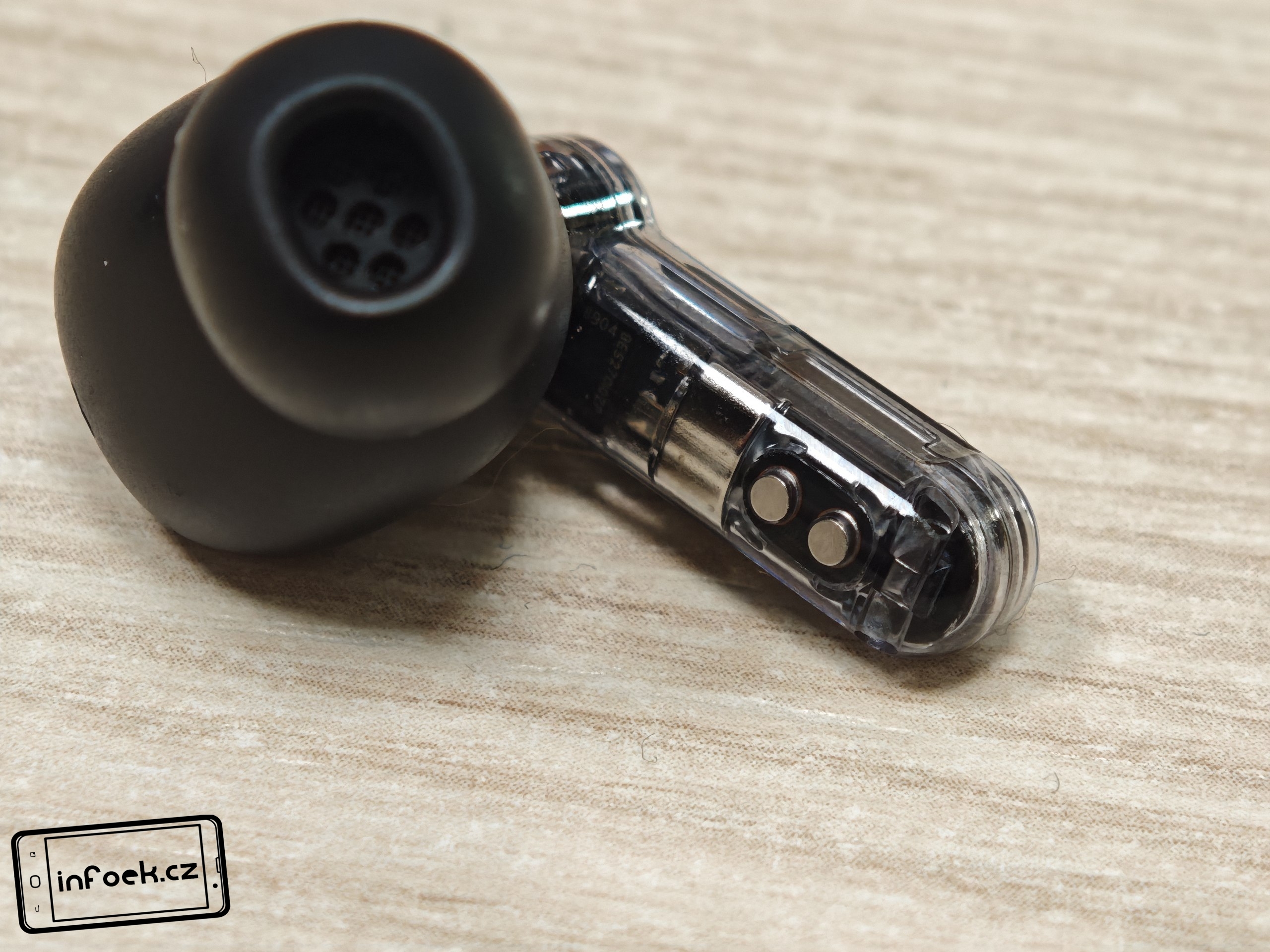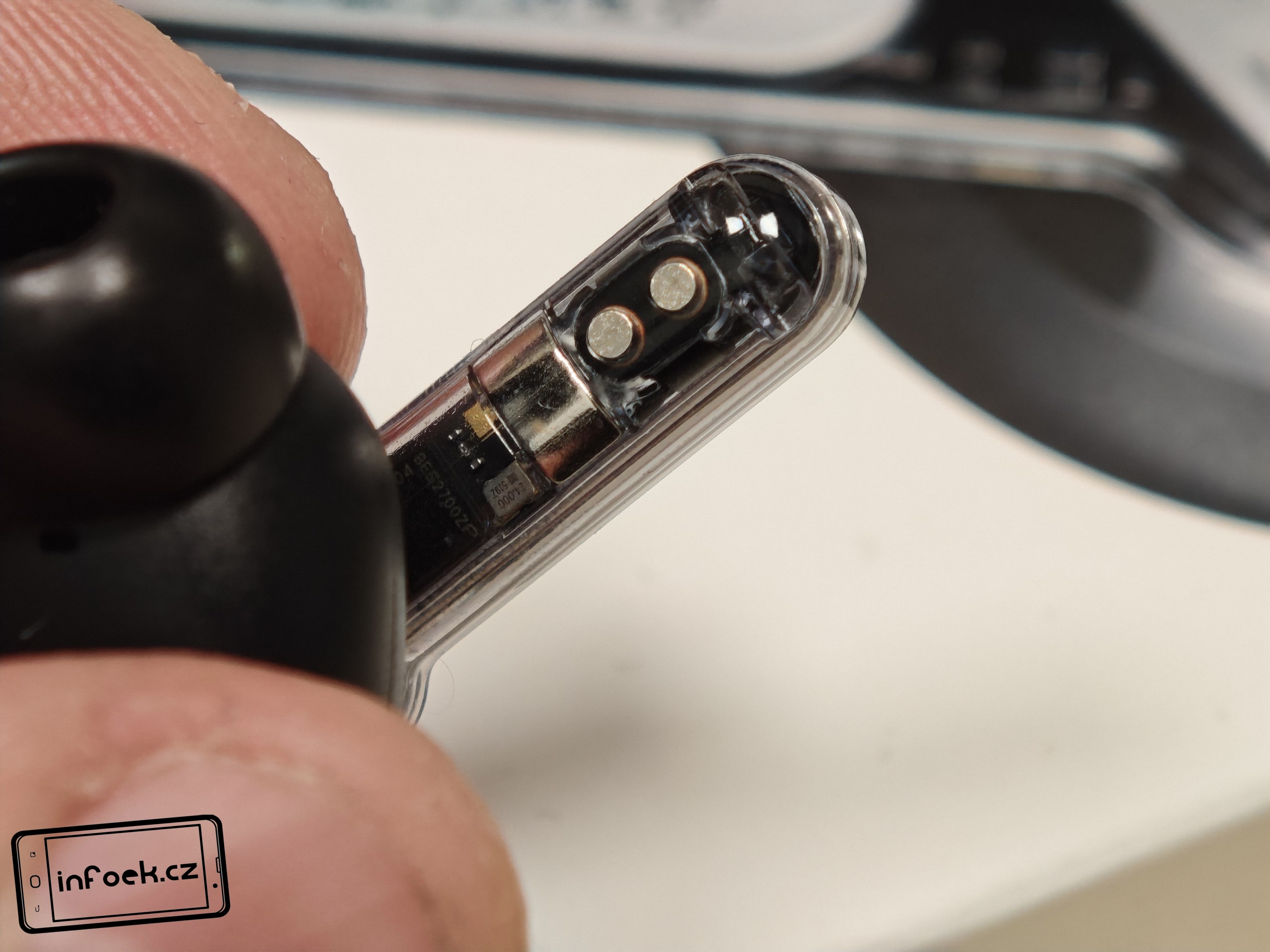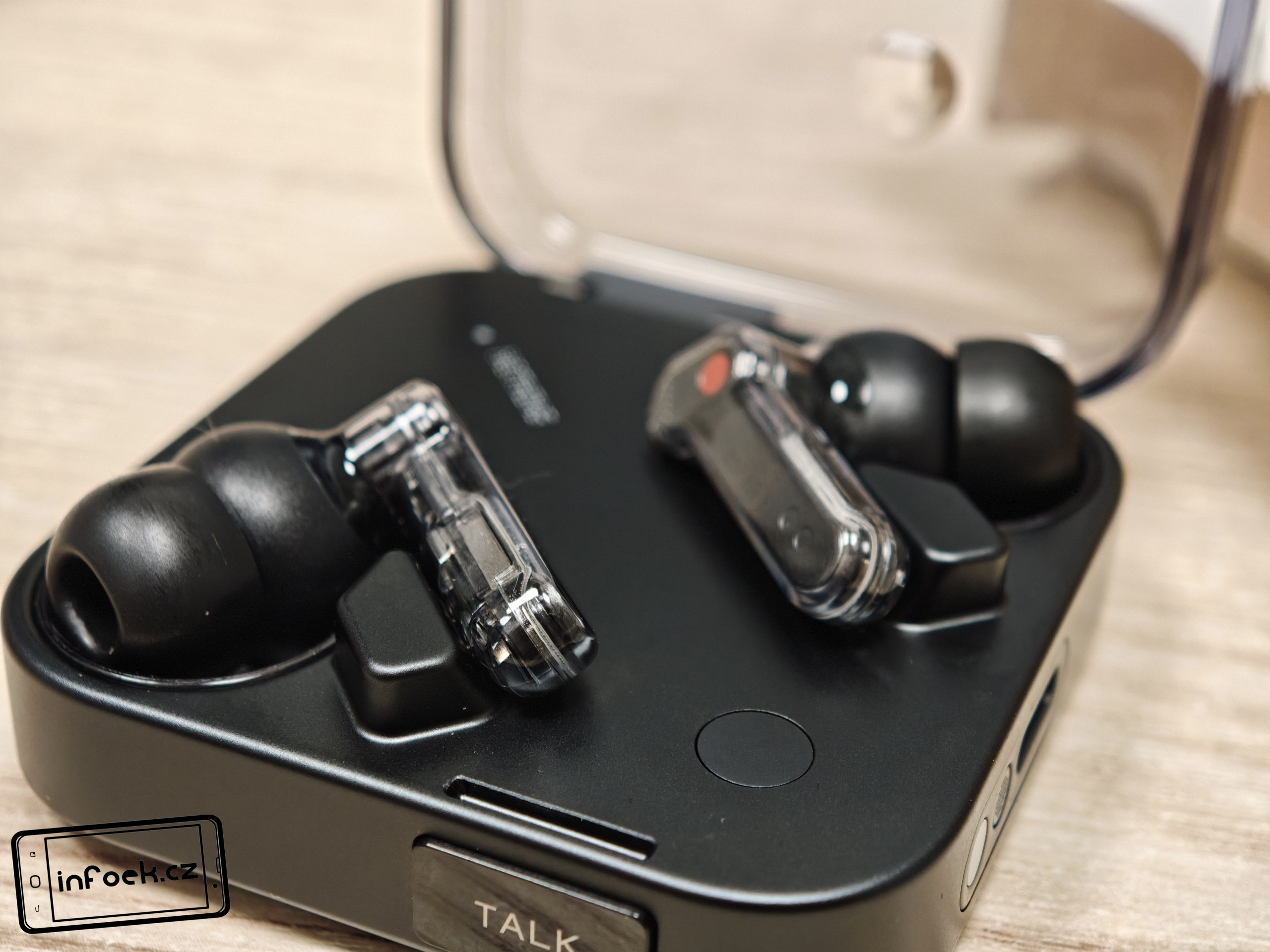 Sluchátka jsou k dispozici v bílém a černém barevném provedení. Já testoval černou verzi, přičemž v obou případech má horní plastové víko nabíjecího pouzdra průhledné provedení. Ve víku je prohlubeň pro pohodlnější držení. Další průhledné části najdeme po vyjmutí sluchátek. Uvnitř krabičky je modelové označení, barevná dioda, nabíjecí piny, magnetické uchycení sluchátek a fyzické tlačítko pro párování či reset. Pochválit musím i umístění sluchátek uvnitř krabičky – díky dostatečným mezerám je vyjmutí pohodlné i při chůzi.