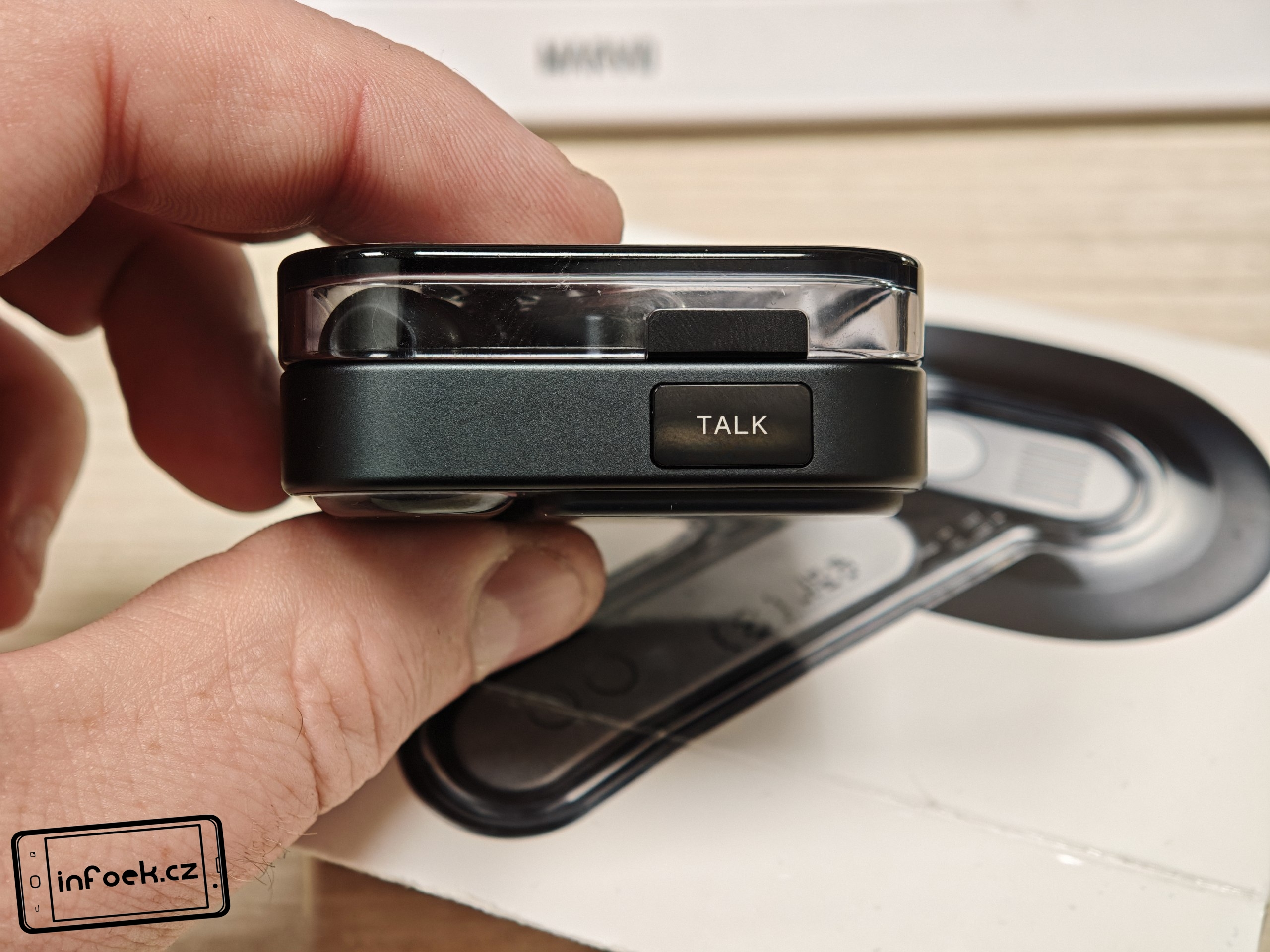 Výrobce se chlubí hliníkovým proužkem po stranách, který krabičce dodává robustnější a luxusnější vzhled. Na přední části se nachází fyzické tlačítko „TALK“. Pravý bok ukrývá USB-C konektor pro nabíjení, mikrofon a diodu značící aktivní mikrofon. Levý bok má zdířky pro provléknutí poutka.