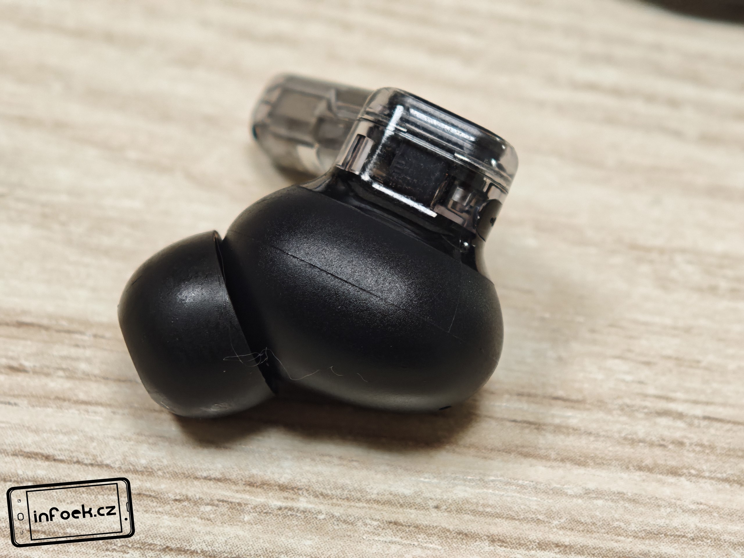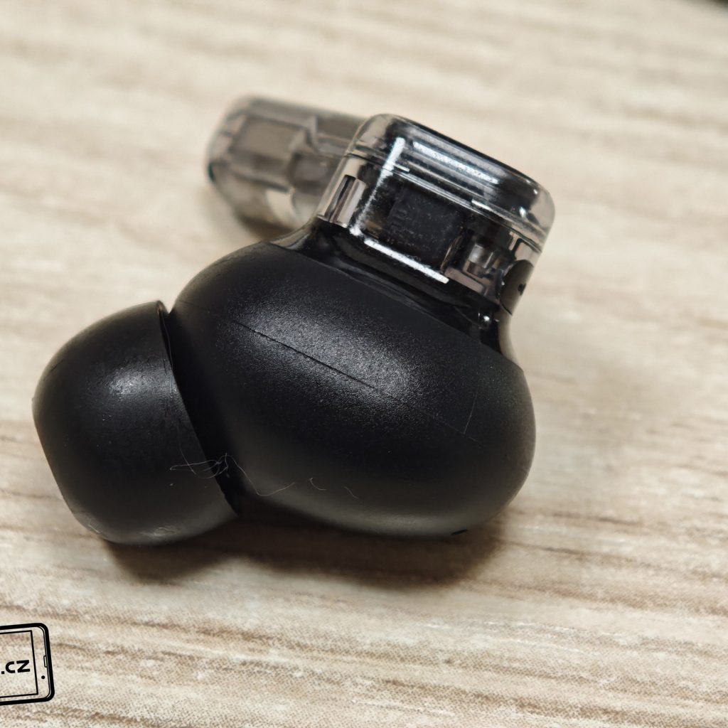Na každém sluchátku se nachází nožička s modelovým označením a dotykovou plochou po stranách. Každé sluchátko má vyměnitelný gumový špunt a v uších sedí velmi dobře. Ergonomii jsem si po celou dobu chválil a sluchátka nosil i při jízdě na elektrické koloběžce – ani jednou nevypadla z uší. Jsou také lehká a dle výrobce váží jedno sluchátko 5,2 gramu.