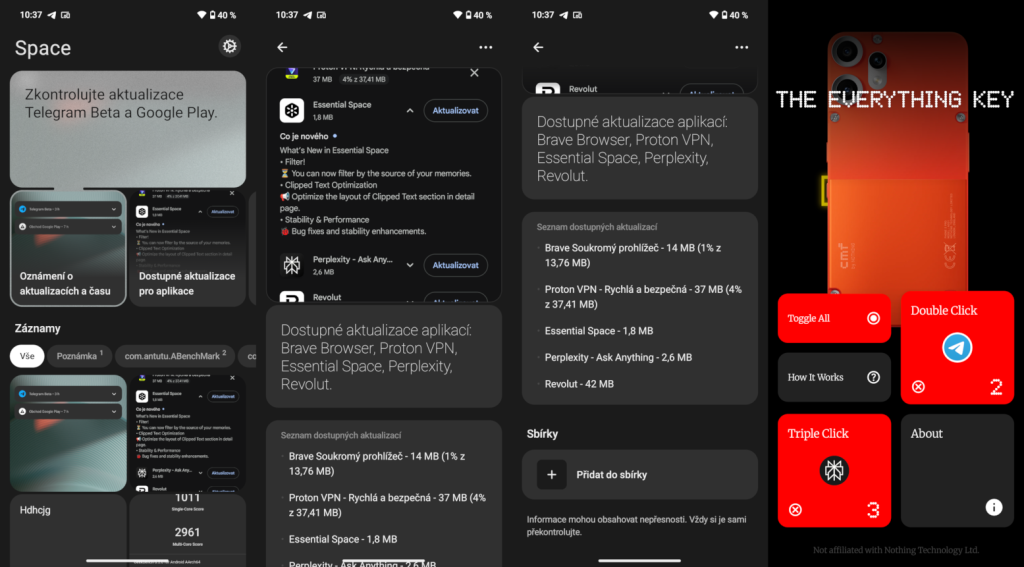Je možné tlačítku přiřadit další funkce? Nedávno vyšla aplikace The Everything Key od nezávislého vývojáře, která umožňuje namapovat fyzickému tlačítku i jiné funkce. Můžete tak spustit nejen Essential Space, ale i například e-mailového klienta nebo Telegram. Tlačítko tak může nabízet více možností.
