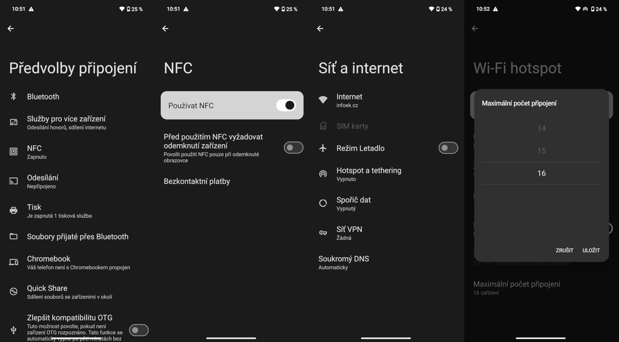 K bezdrátovým sítím Wi-Fi 6 a starším se telefon připojuje bez problémů. Za nasazení této verze chválím a spokojen byl jsem i s citlivostí antén. Pro různá chytrá zařízení nebo bezdrátový poslech slouží výborný Bluetooth 5.4 a verze pro náš trh má NFC cívku s podporou bezkontaktních plateb přes Google Pay, Curve Pay a další.