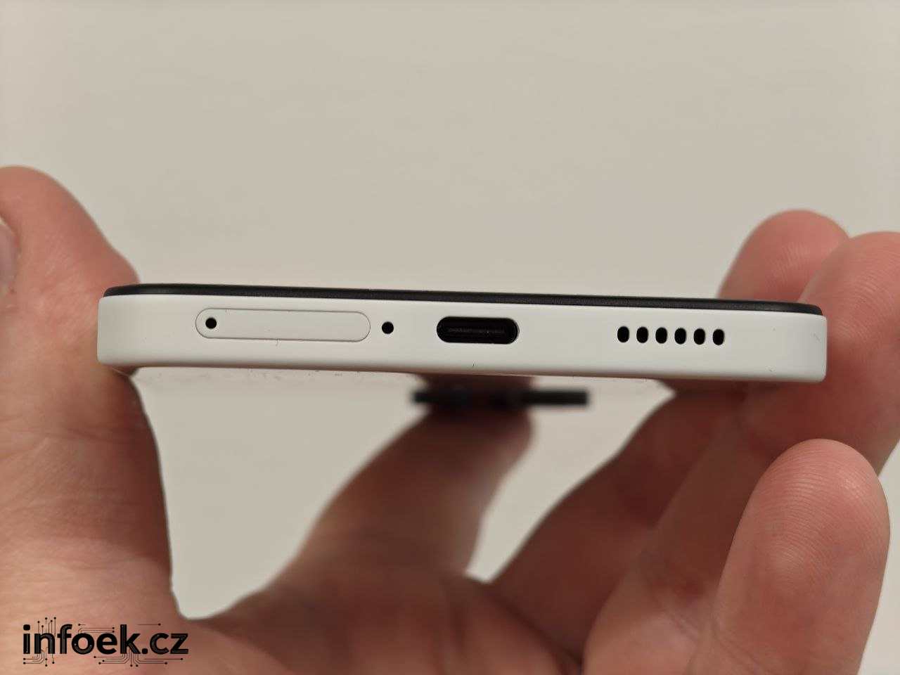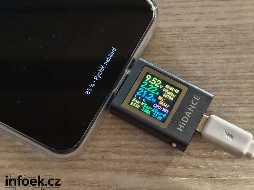 Pro nabíjení slouží USB-C konektor, bezdrátové nabíjení telefon nemá. Podporována je rozšířená technologie Power Delivery, což jsem vyzkoušel s adaptérem FIXED. V prodejním balení kvůli legislativě EU nabíječka není. Výrobce uvádí maximální výkon 33 W, já během testu naměřil 27 W – vzhledem k ceně dostatečné. Během nabíjení dochází ke ztrátám, proto měřák neukáže maximum.