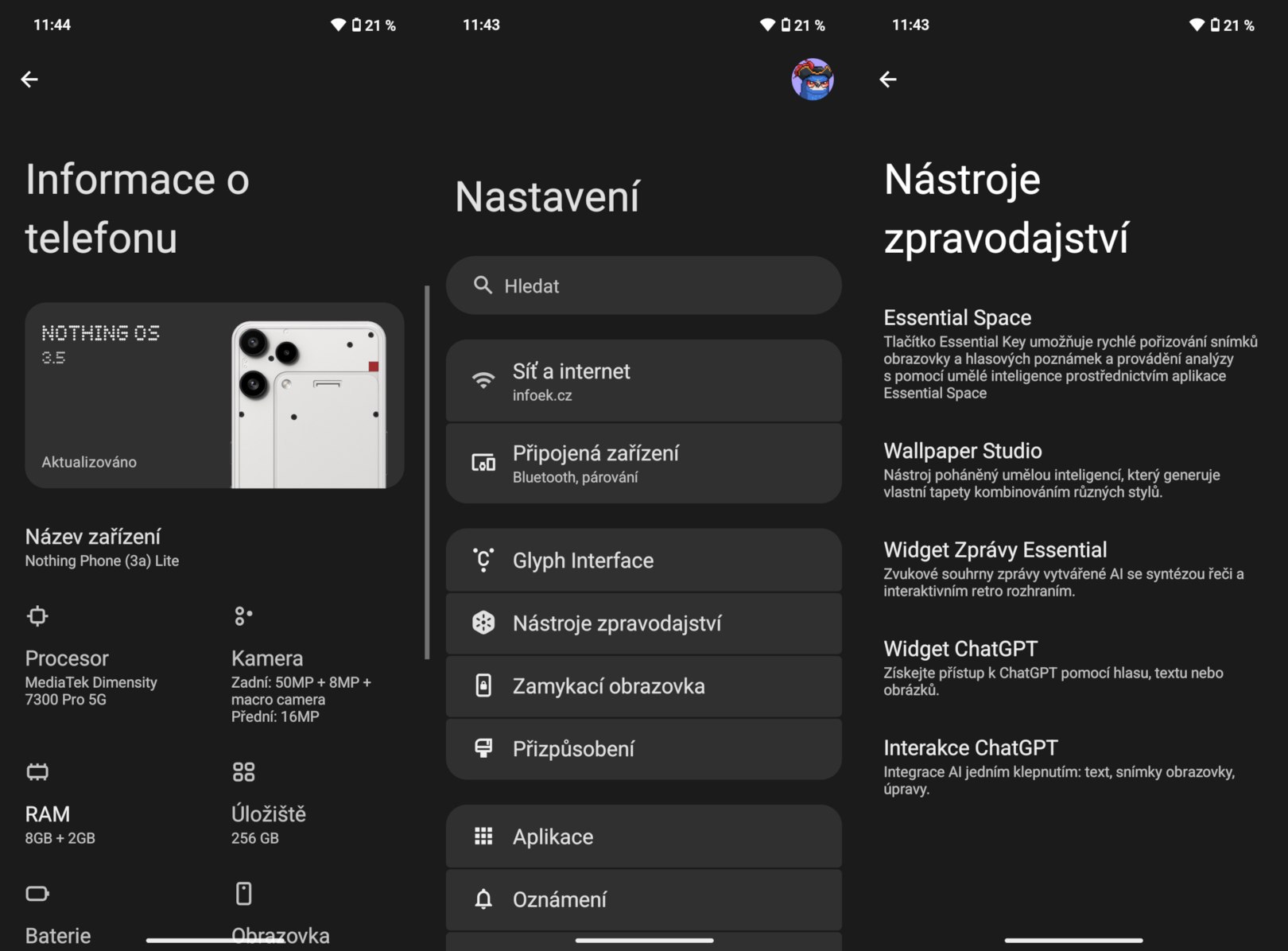 Prostředí chválím i za bezdrátové ladění, které ocení pokročilí uživatelé. Bez omezení lze neoficiálně odinstalovat systémové appky, já jsem odstranil především od Meta a Google (Chrome, Disk, Gemini, celý asistent, přímo aplikace Google atd.). Zamykací obrazovka je zbytečná a otravná, ale Nothing umožňuje ji úplně vypnout – podrobnosti v mém návodu.