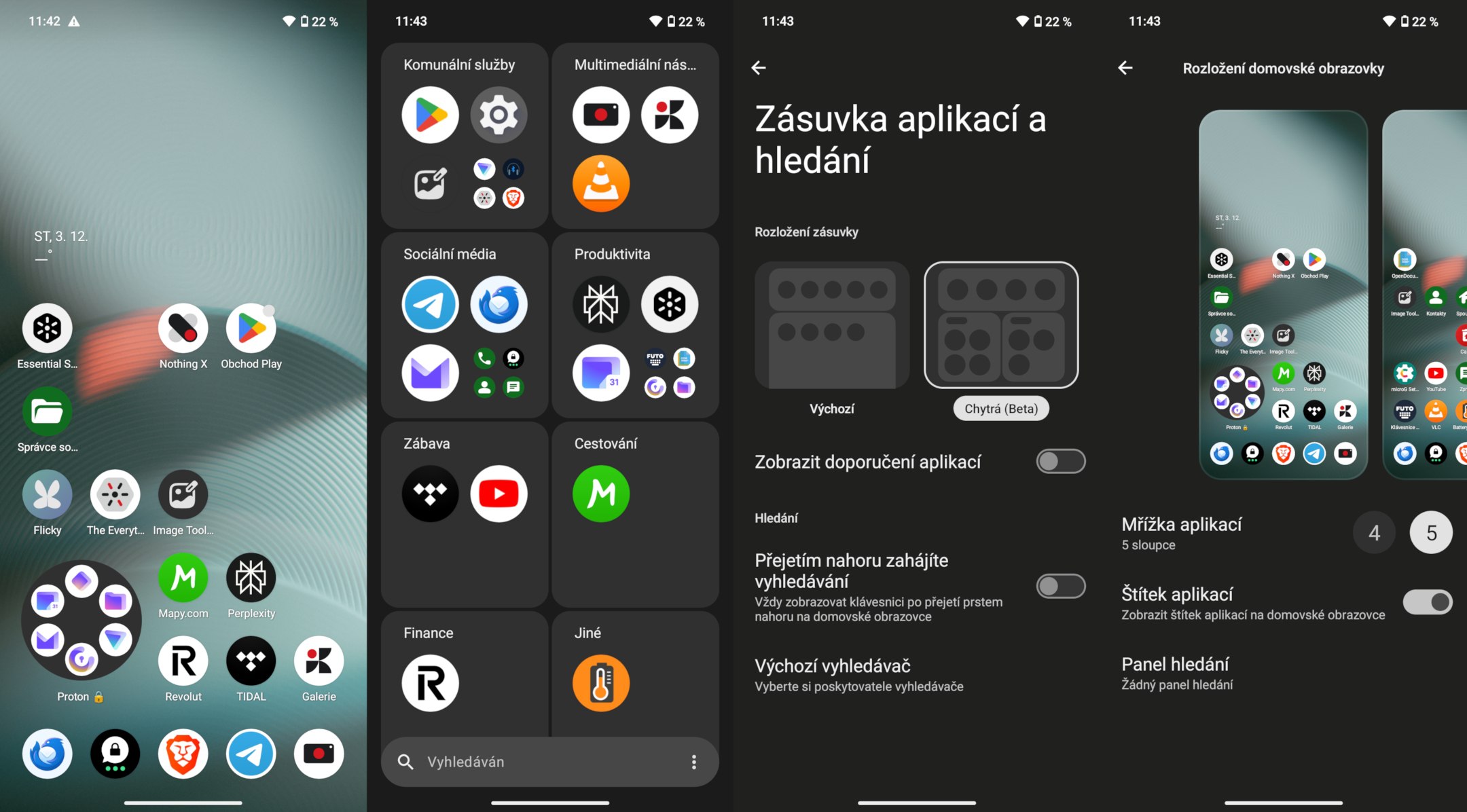 Nothing OS často přirovnávají k „čistému Androidu“, což není pravda a jsem za to rád. Prostředí je hezčí, přehlednější, s vlastními widgety na hlavní a zamykací obrazovku, Essential Space, personalizací složek či lepším menu aplikací. Má své výhody a já jsem s ním spokojený.