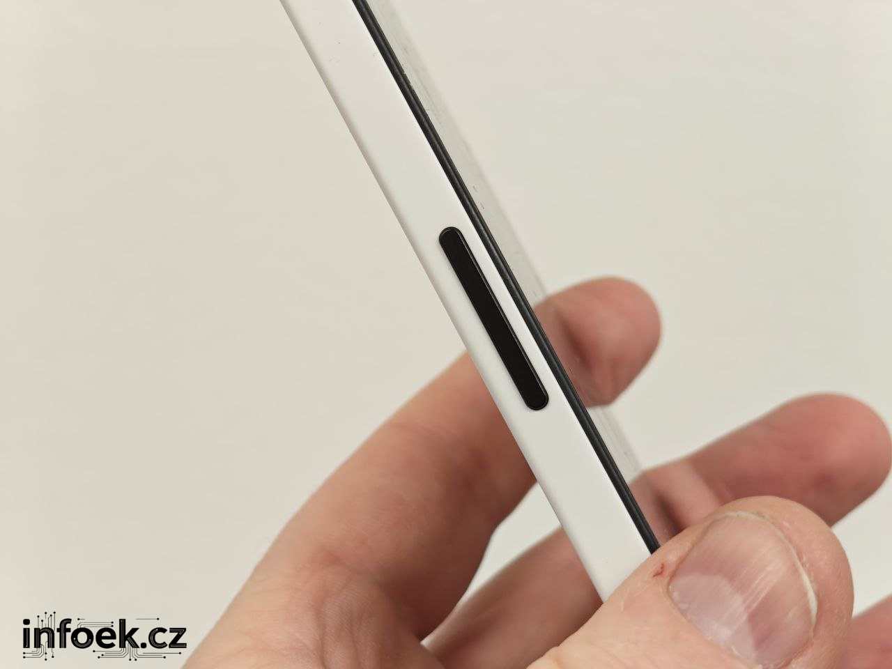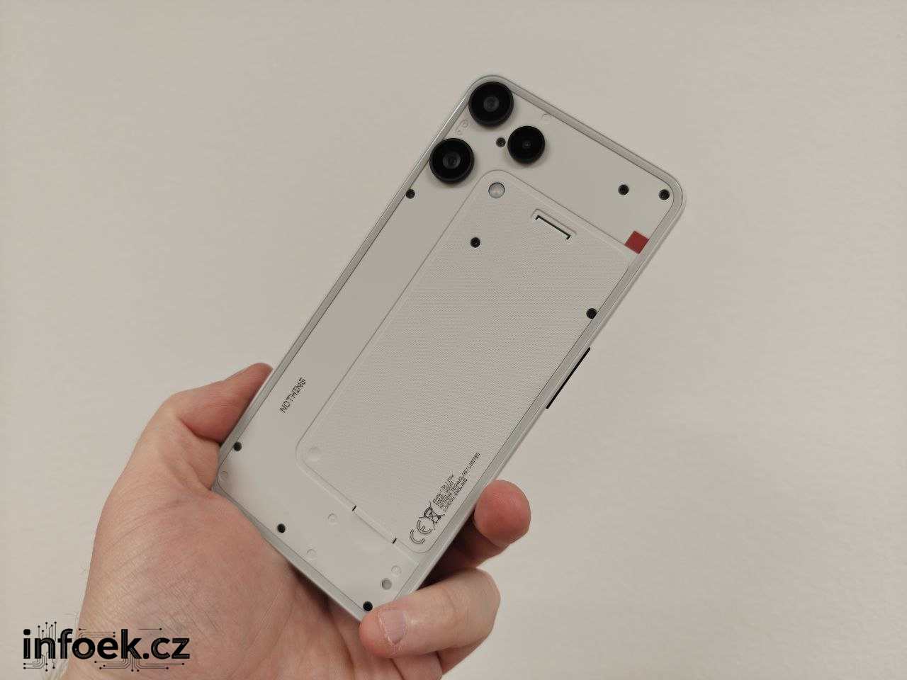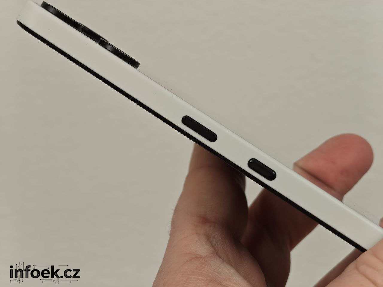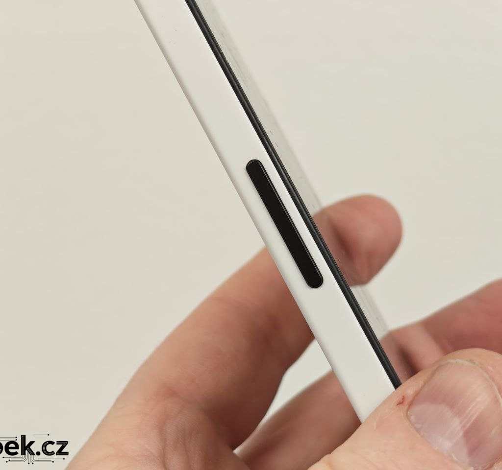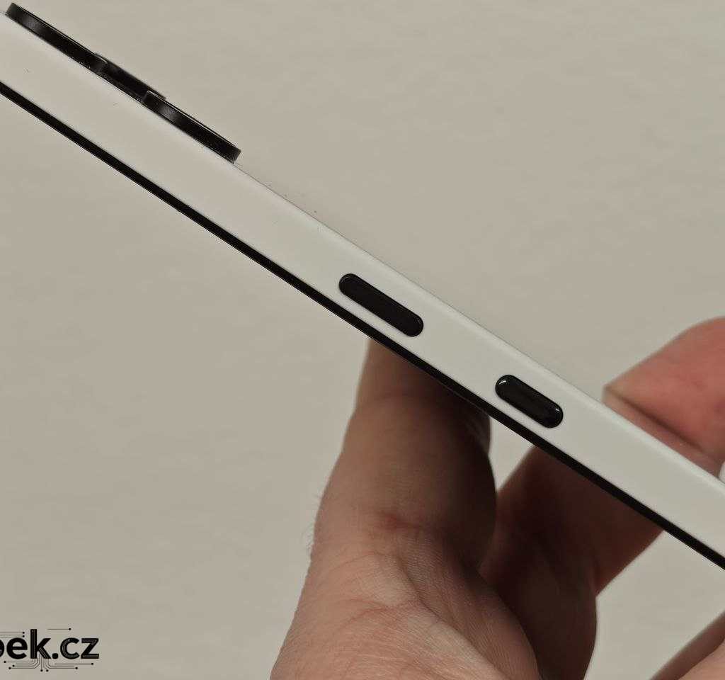 Na horní části mobilu je zdířka mikrofonu, levý bok typicky pro Nothing nabízí tlačítka regulace hlasitosti, pravý bok zamykací tlačítko a tlačítko Essential Space, k němuž se ještě dostanu. Líbí se mi barevná kombinace bílé s decentními černými tlačítky. Spodní část mobilu pak v sobě ukrývá hybridní slot, mikrofon, USB-C a reproduktor. Jedná se o moderní větší mobil o rozměrech 164 x 78 x 8,3 mm.