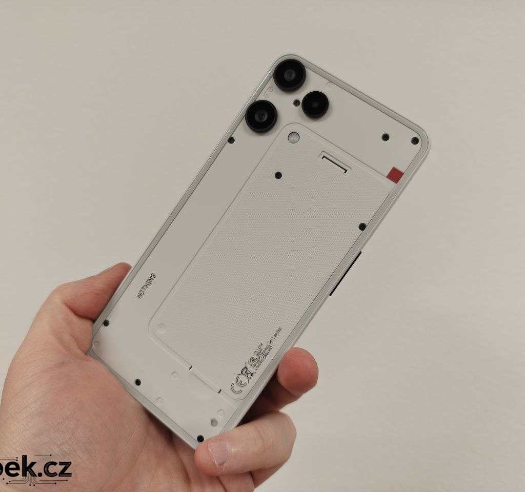 Ze zadní strany vystupuje trojice fotoaparátů, vedle je LED přisvětlovací dioda a na sodní zadní části je další bílá dioda, ale k té se ještě dostanu. Pod sklem můžeme vidět design lehce připomínající vlajkový model Nothing Phone (3). Rám mobilu je plastový a proti jeho zpracování vlastně nic nemám.