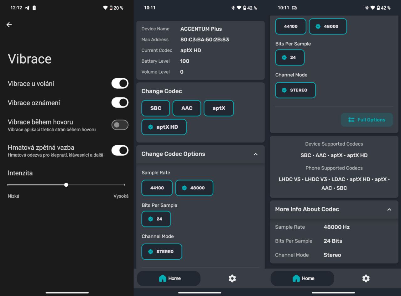 Výrobce uvádí nasazení novější verze Bluetooth 5.4, což musím pochválit. Verze Bluetooth jsou kvůli bezpečnosti důležité, ale u dostupnějších modelů výrobci často nasazují starší verze. Potěší i přítomnost audio kodeků AptX a AptX-HD od Qualcommu, dále LHDC V5/V3, LDAC, AAC nebo SBC. Po stránce kodeků pro bezdrátový poslech hudby je mobil vybaven vzhledem k ceně výborně – detekoval jsem maximální vzorkovací frekvenci 48 kHz s 24 bity.