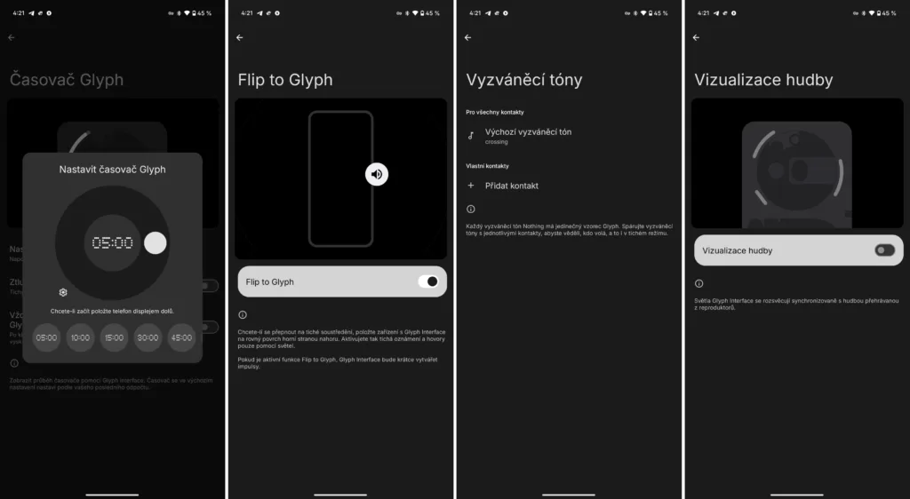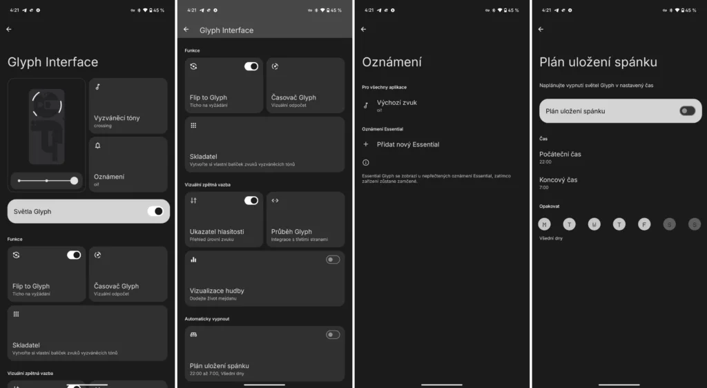Blikat proužky umí během příchozích oznámení z jakékoliv mobilní aplikace. To může být v noci rušivé, proto přímo v rolovací systémové liště je ikona pro rychlé zapnutí či vypnutí blikání. Nastavit si můžete časové rozmezí zapnutí funkce a automaticky bude docházet k jejímu vypnutí ve zvolený čas. Praktická je ještě funkce „Flip to Glyph“ pro přechod do tichého režimu otočením mobilu displejem na stůl. Vytvořit si můžete vlastní sekvence blikání pro vyzvánění, používat ho s pár podporovanými aplikacemi třetích stran, diodou lze zobrazit úroveň hlasitosti, vizualizaci při poslechu hudbu nebo třeba hraní her a používat časovač.