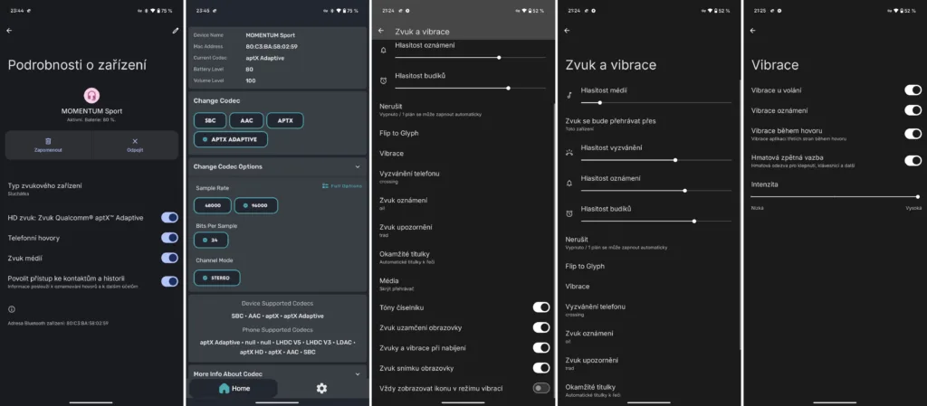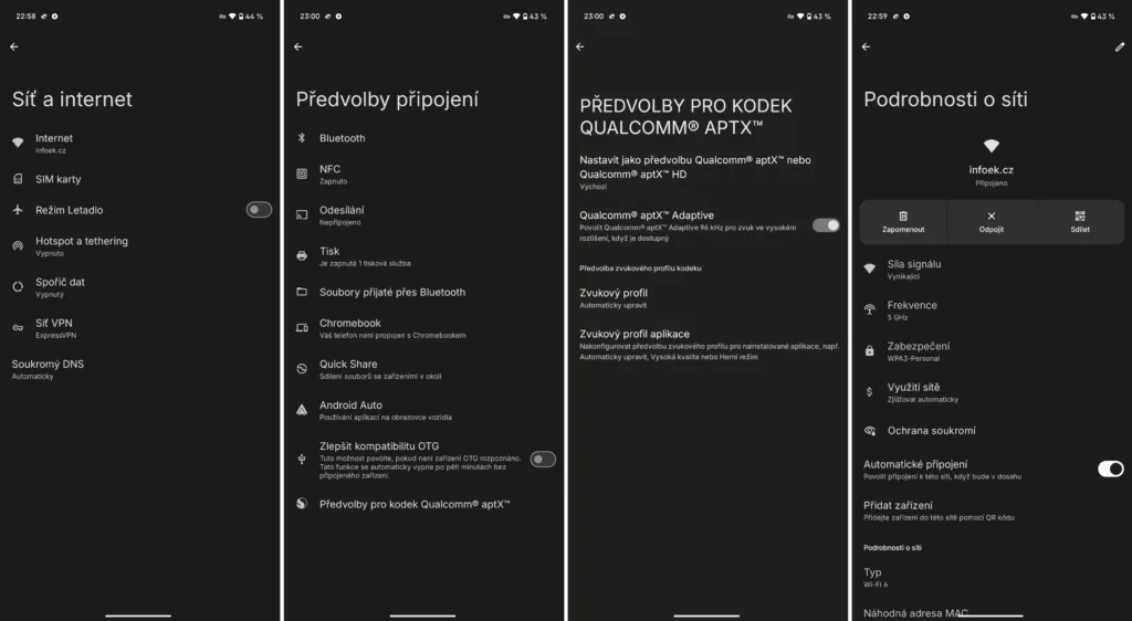 Pro bezdrátový poslech hudby slouží novější verze Bluetooth 5.4. Ta je nejen šetrná ke spotřebě, ale je výborná pro zvuk a dosah. S bezdrátovým poslechem hudby jsem byl po celou dobu testování spokojený a podporovány jsou kodeky: Qualcomm aptX Adaptive, aptX HD, aptX, LHDC V5 a LHDC V3, LDAC, AAC a SBC. Žádný důležitý tedy nechybí a v kodeku aptX Adaptive je mobil schopen poskytnout vzorkovací frekvenci 96 kHz s 24 bity, ale musíte to povolit v: Nastavení telefonu, Připojená zařízení, Předvolby připojení, Předvolby pro kodek Qualcomm aptX.