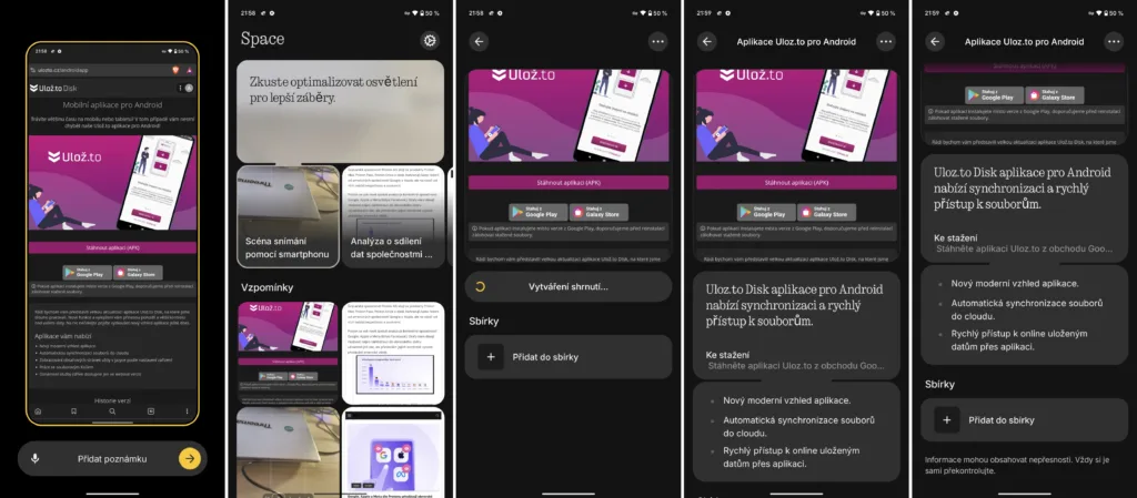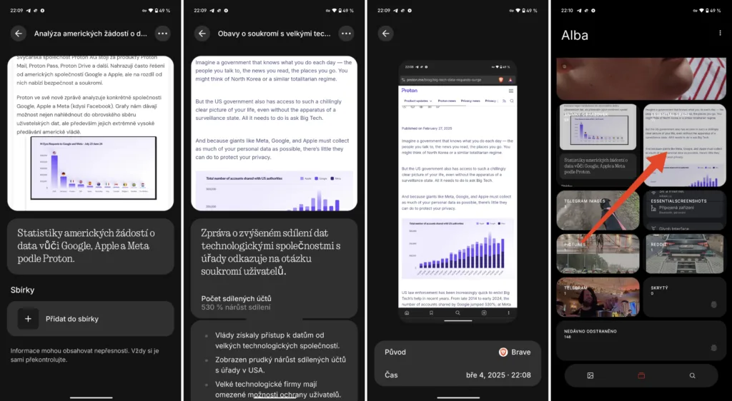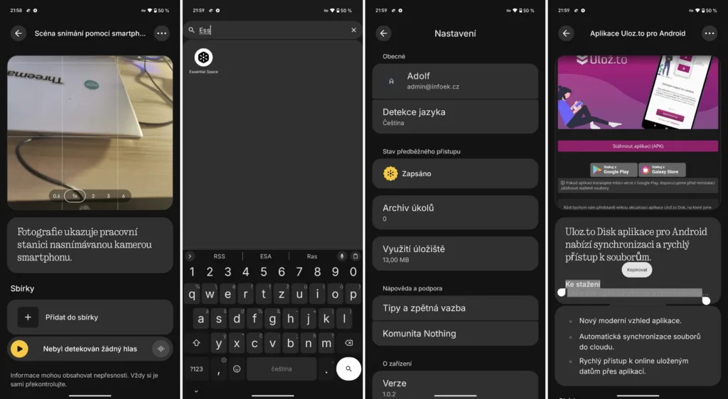 Funkce se mi vlastně líbí a myslím si, že výrobce ji bude nadále vylepšovat. Stačí tlačítko jednou stisknout a dojde k vytvoření screenshotu. Níže můžete klepnout na šipku a screenshot poslat do Essential Space nebo ještě přiložit audio poznámku. Vše pak najdete v Essential Space a dostanete se do něj dvojitým stiskem tlačítka nebo otevřením aplikace se stejným názvem. Všechny důležité screeny se shrnutími máte tedy stále po ruce. Text ze souhrnu lze zkopírovat a vložit do jiné aplikace a osobně mi chybí text manuálně poupravit nebo vytvořit od začátku nový. Samotný screenshot je pak ještě k dispozici v galérii.