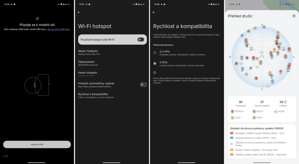 Mobilu po stránce konektivity nic podstatného nechybí. Podporovány jsou všechny moderní mobilní sítě 5G, LTE a starší. Vložit do mobilu můžete dvě fyzické nanoSIM karty nebo si stáhnout eSIM. Podporována je funkce DualSIM a musíte si vybrat, zda chcete dvě fyzické nebo jednu fyzickou a druhou eSIM. Mobilní data lze sdílet do dalších zařízeních pomocí Wi-Fi hotspotu Wi-Fi 5 a Wi-Fi 4. Připojovat se můžete ještě k bezdrátovým sítím Wi-Fi 6 a novějším. S žádným routerem nebo hotspotem jsem problémy neměl.