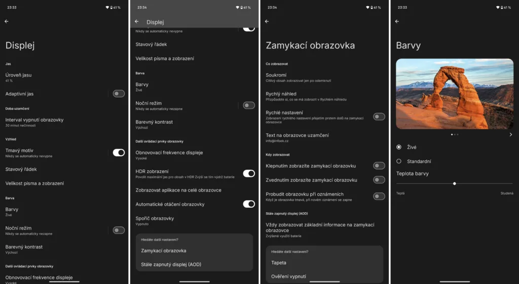 Dost se mi líbí zamykací obrazovka a Always-On (Stále zapnutá displej). Nemá žádné omezení jako velká část současné konkurence. Můžete si načasovat její funkcionalitu a umí zobrazit čas, datum a všechna oznámení. Poskládat si podle sebe můžete různé widgety s procenty nabití, aktuální teplotou venku dle polohy, s časem, fotkami, krokoměrem, odpočítáváním, kompasem nebo rychlým nastavením. Funguje to vážně dobře a rád bych to viděl u všech výrobců.