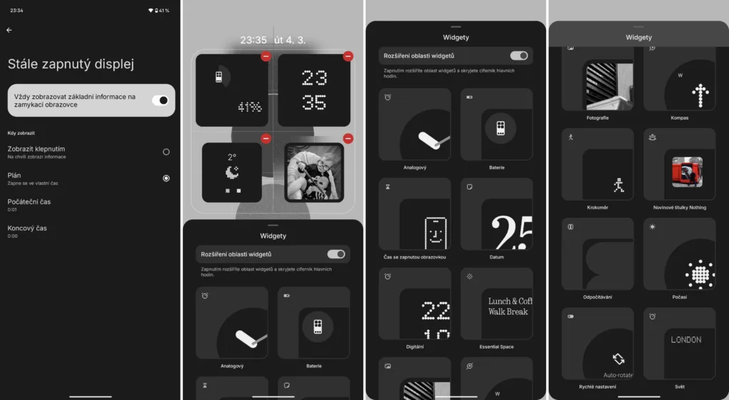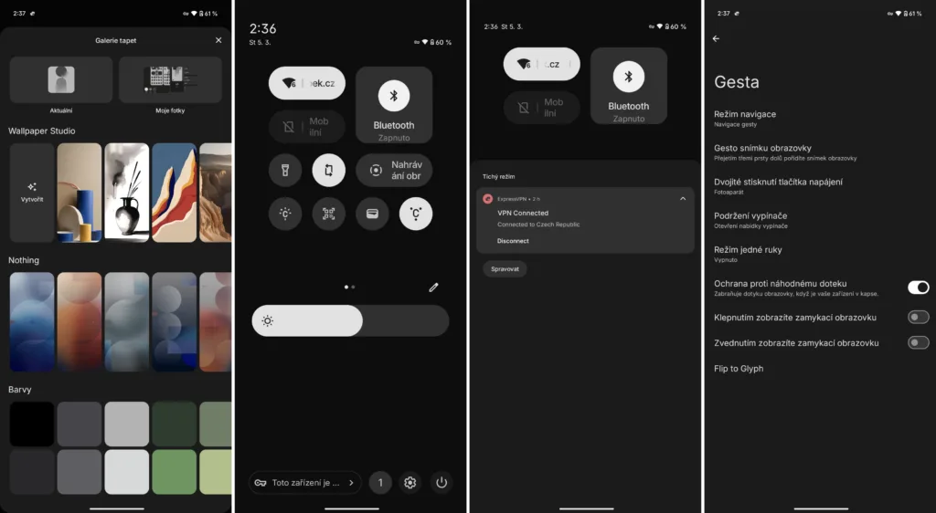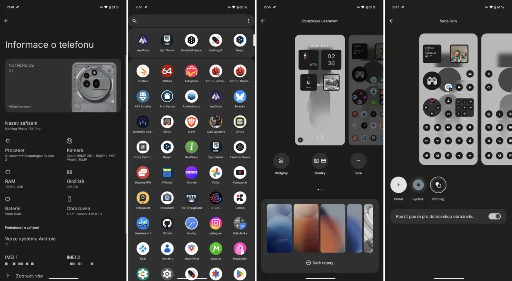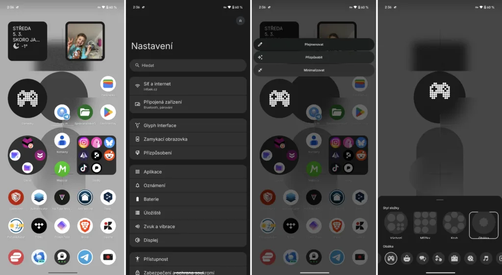 Systém nabízí vlastní systémové tapety a při výběru můžete narazit na funkci „Wallpaper Studio“. Využívá algoritmy a pomocí spojení dvou tapet vytvoří jednu nejspíš unikátní. Vybrat si můžete sady ikon s barevnými ikonami nebo černobílými od Nothing. Po stažení jiných balíčků z Obchodu Play je jejich použití pak velmi snadné.