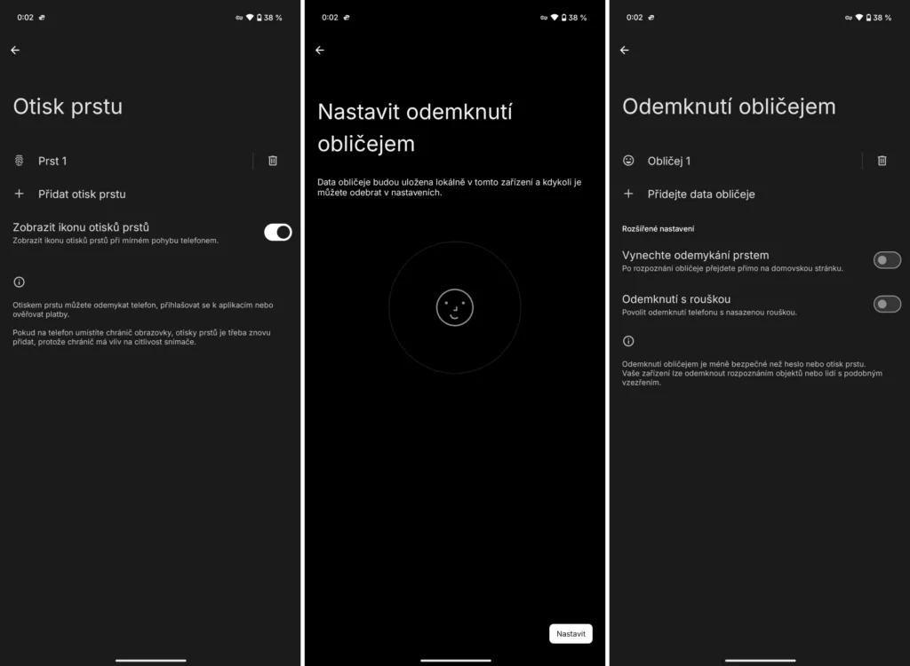Mobil odemykat lze nejen spolehlivou optickou čtečkou otisků prstů, ale i skrze selfie kameru. Umístění čtečky je ideální a funguje spolehlivě přes výrobcem nalepenou ochrannou fólii. Řešení se selfie kameru není nejbezpečnější, ale kdo by se ho zrovna u vás pokoušel obcházet, že? Nastavit si můžete dva obličeje a nemusí jít jen o vás, ale třeba o někoho dalšího.