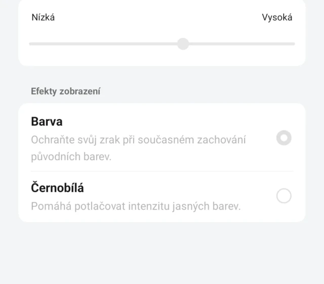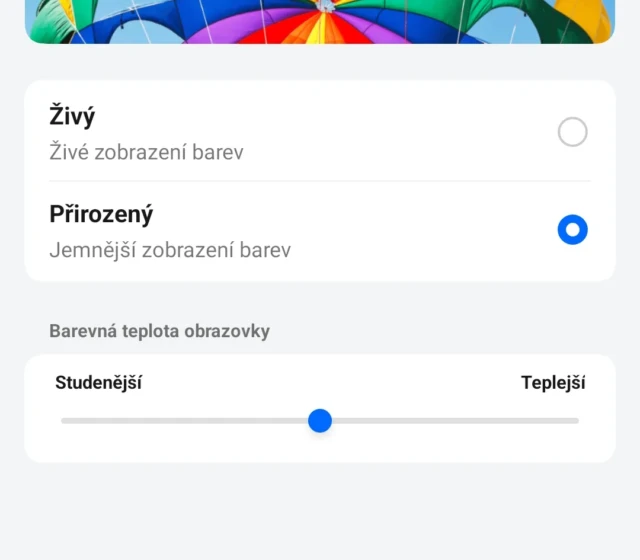 V nastavení displeje si můžete vybrat přirozené nebo takové živější barevní podání. Já osobně mám raději přirozené a byl jsem s ním spokojený. Vypnout nebo zapnout můžete samozřejmě automatické otáčení, upravit velikost prvků v prostředí a písma.