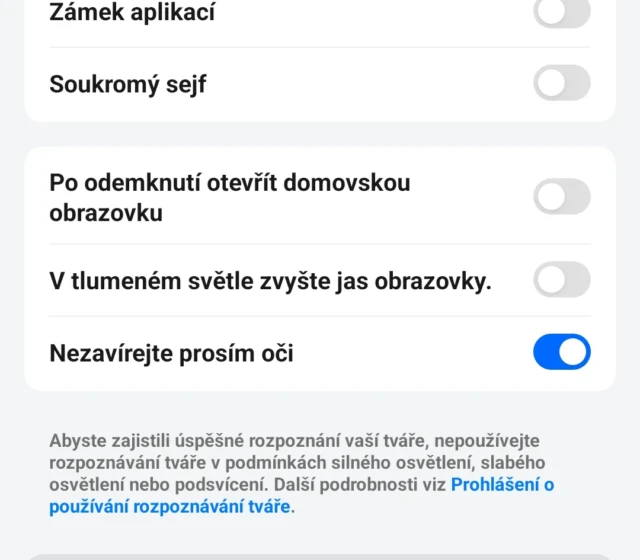 Skrze selfie kamerku se můžete nejen fotit, ale mobil odemykat také. Můžete mít nastavení odemykání otiskem i obličejem a využívat tyto funkce dle potřeby. To se může hodit, pokud zrovna máte zašpiněné ruce. Odemykání je rychlé a spolehlivé i za horších světelných podmínek. V nastavení se nachází ochrana, aby odemykání fungovalo jen se zavřenýma očima.