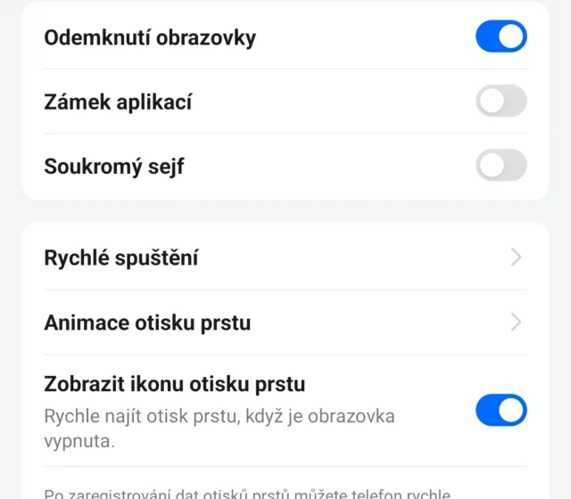 Oppo Reno11 F 5G má čtečku otisků prstů ukrytou pod displejem. Umístění je ideální a snadno na ní dosáhnete palci. Senzor reaguje spolehlivě i přes nalepenou fólii od výrobce. Odemykání je rychlé, můžete si nastavit animaci během odemykání a otiskem odemykat vybrané aplikace nebo soubory ze sejfu.