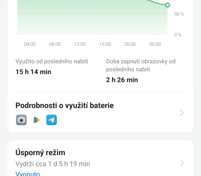 Evropská verze mobilu v sobě ukrývá akumulátor o kapacitě 5000 mAh. To je slušná kapacita, MediaTek je energeticky šetrnější a výrobce skvěle zvládl i optimalizaci systému. Ta se zlepšila především poslední velkou aktualizací systému. Procenta nabití budou mizet dle vašeho používání. Celý náročný pracovní den s mobilem vydržíte a pokud nebudete neustále na TikToku s vysokým jasem nebo hrát hry, můžete vydržet i dva dny na jedno nabití. Pokud ale budete hrát, procenta budou samozřejmě mizet o poznání rychleji.