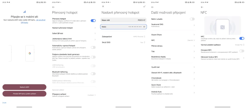 POCO X7 5G je moderním modelem, proto mu nechybí kvalitní konektivita. V malé šuplíku se nachází dva sloty pro vložení nanoSIM karet. Chválím za přítomnost funkce eSIM. Oba podporují všechna potřebná pásma pro mobilní sítě 5G a LTE. Svůj mobilní internet můžete přátelům sdílet až ve verzi Wi-Fi 6. Zakázat můžete automatické vypínání hotspotu a připojit se můžete k jakémukoliv Wi-Fi routeru až do verze Wi-Fi 6.