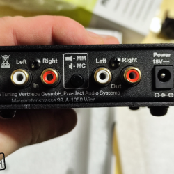 Čelní plocha nemá žádný křiklavý design, což já osobně jen vítám. Najdeme na ní jen logo a šroubky pro případný servis. Zadní část nabízí vše potřebné. Zpracování konektorů působí kvalitním dojmem, nijak se neviklají a se zapojením jsem neměl žádné problémy. RCA konektory jsou pozlacené, nechybí zemnící svorka, MM/MC přepínač a napájecí konektor. Milé překvapení čeká vespod předzesilovače, kde jsou pogumované nožičky proti klouzání zesilovače po nábytku, ale i štítek „Made in Slovakia“. Nejen gramofony, ale i předzesilovače tedy Pro-Ject vyrábí v Evropě, nikoliv někde v Číně. To rozhodně jen chválím.