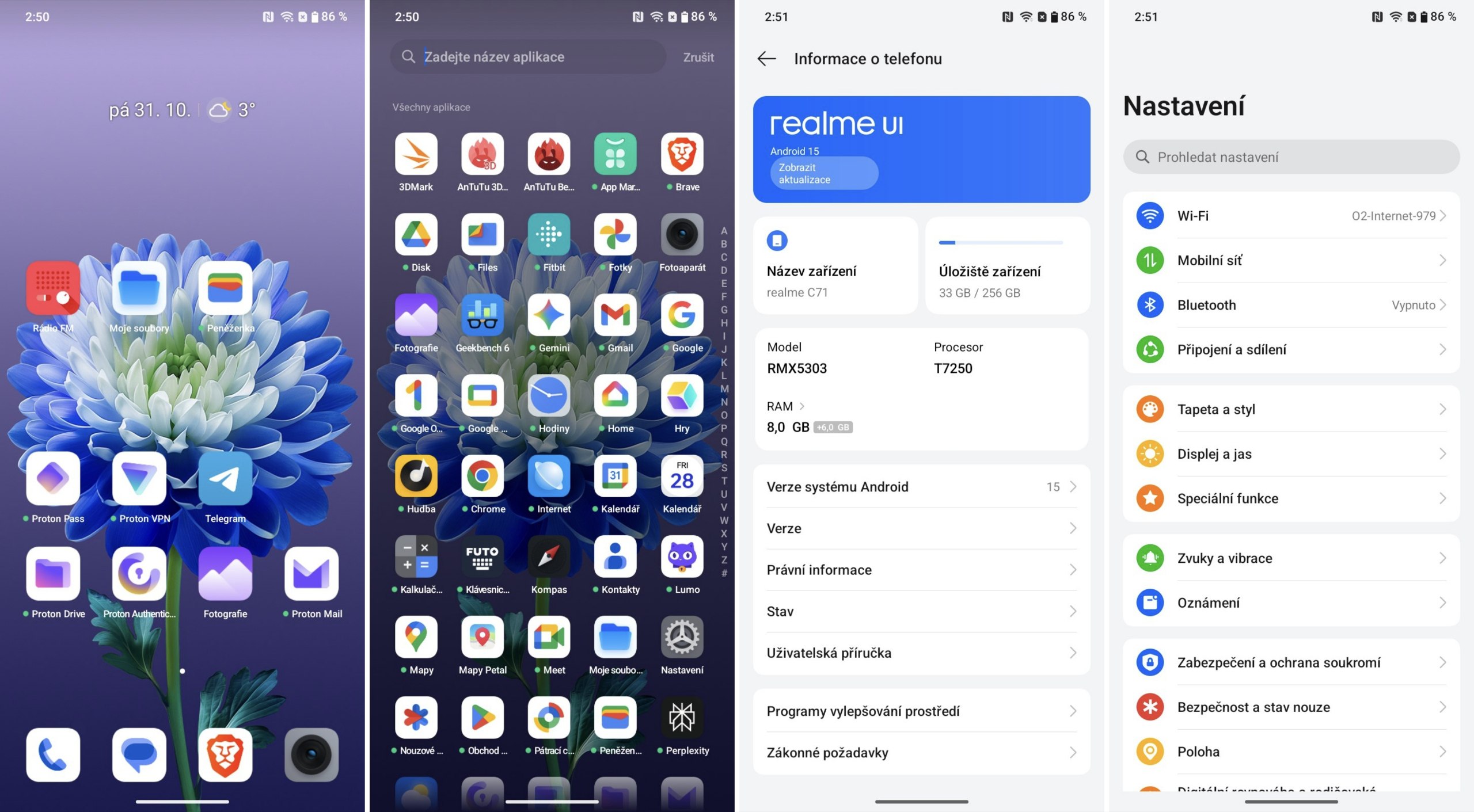 Mobil jsem měl možnost testovat dlouhodobě a vlastně jsem ho obdržel hned po jeho uvedení na trh. Jeho prostředí bylo zpočátku pomalejší, což jsem přičítal procesoru Unisoc. Obdržel však dvě větší aktualizace s mnoha opravami, a to nejen kompletním počeštěním, ale i optimalizací. Nyní je prostředí realme UI postavené na Androidu 15 na danou třídu svižné.