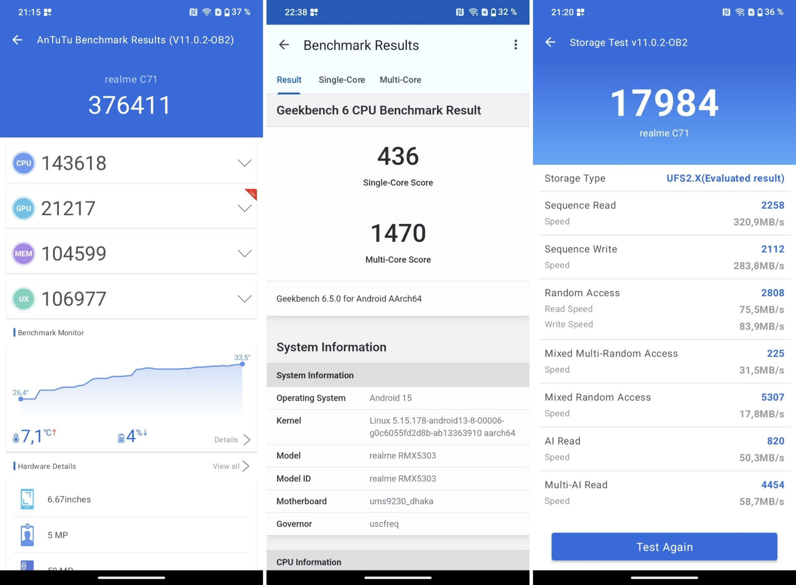 Test výkonu v AnTuTu Benchmark, Geekbench 6 a test úložiště v AnTuTu Storage Test