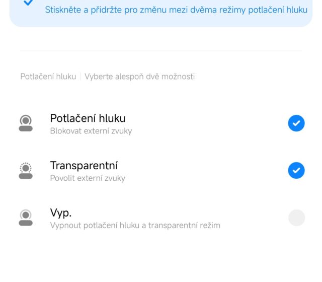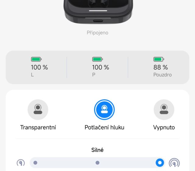 Co aplikace vlastně umí? Zobrazí informace o stavu nabití obou sluchátek i nabíjecí krabičky a můžete povolit či zakázat ANC nebo transparentní režim. Posuvníkem je možné potlačení nebo propouštění hluku upravovat. Personalizovat můžete ovládací gesta, zvuk, zapnout detekci nasazení sluchátek, provést test přiléhavosti ušního nástavce, povolit nebo zakázat používání se dvěma zařízeními, automaticky přijímat hovory, aktualizovat firmware sluchátek a sluchátka je možné v případě ztráty prozvonit.