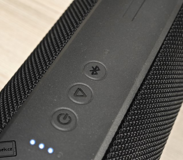 Reproduktor působí opravdu kvalitním dojmem a jeho design se mi dost líbí. Není nijak křiklavý, tedy až na podsvícení po stranách, které můžete i vypnout. Většinu reproduktoru pokrývá povrch z tkaniny. Chválím také za to, že je na reproduktoru dobře viditelný stavový indikátoru nabití reproduktoru a dostatečně velká fyzická tlačítka. Nechybí ani gumová záslepka ukrývající AUX pro drátový poslech, slot pro paměťové karty MicroSD a nabíjecí konektor USB-C.