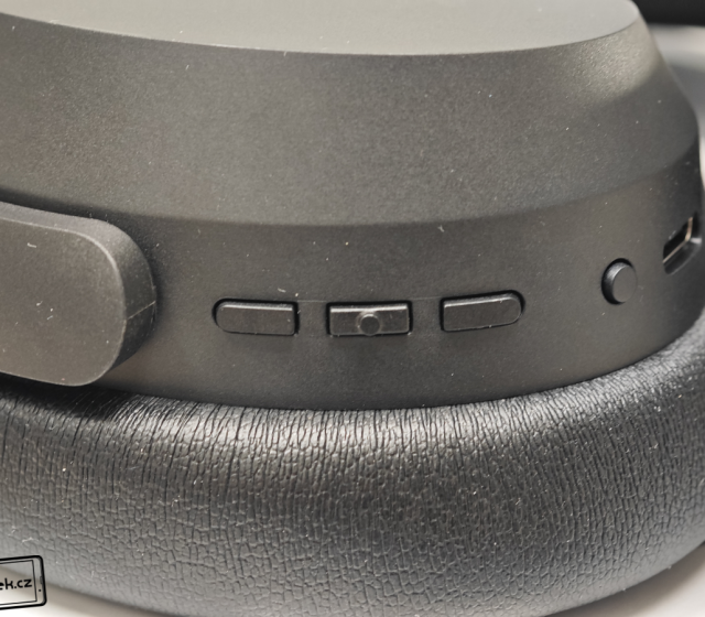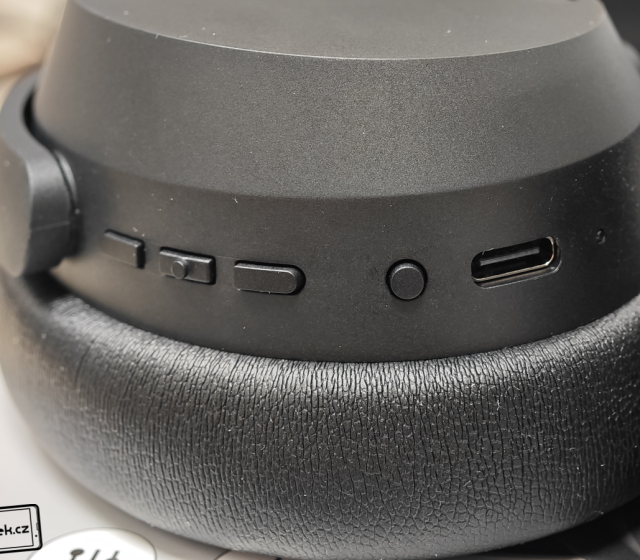 Všechna důležitá tlačítka na sobě má pravá mušle. Dvě tlačítka slouží pro ovládání úrovně hlasitosti a prostřední výraznější tlačítko pak pro pozastavení, spuštění přehrávání a dvojitým rychlým stiskem pro přeskakování skladeb. Hned vedle USB-C konektoru najdeme čtvrté tlačítko, a to slouží pro zapnutí/vypnutí sluchátek a jejich uvedení do režimu párování. Nezapomnělo se ani na diodu, která umí blikáním upozornit např. za zapnutí sluchátek, ale během nabíjení víte, zda jsou sluchátka již nabitá. 0–20 % nabití je červená barva diody, 20–90 % žlutá a 90–100 % zelená.