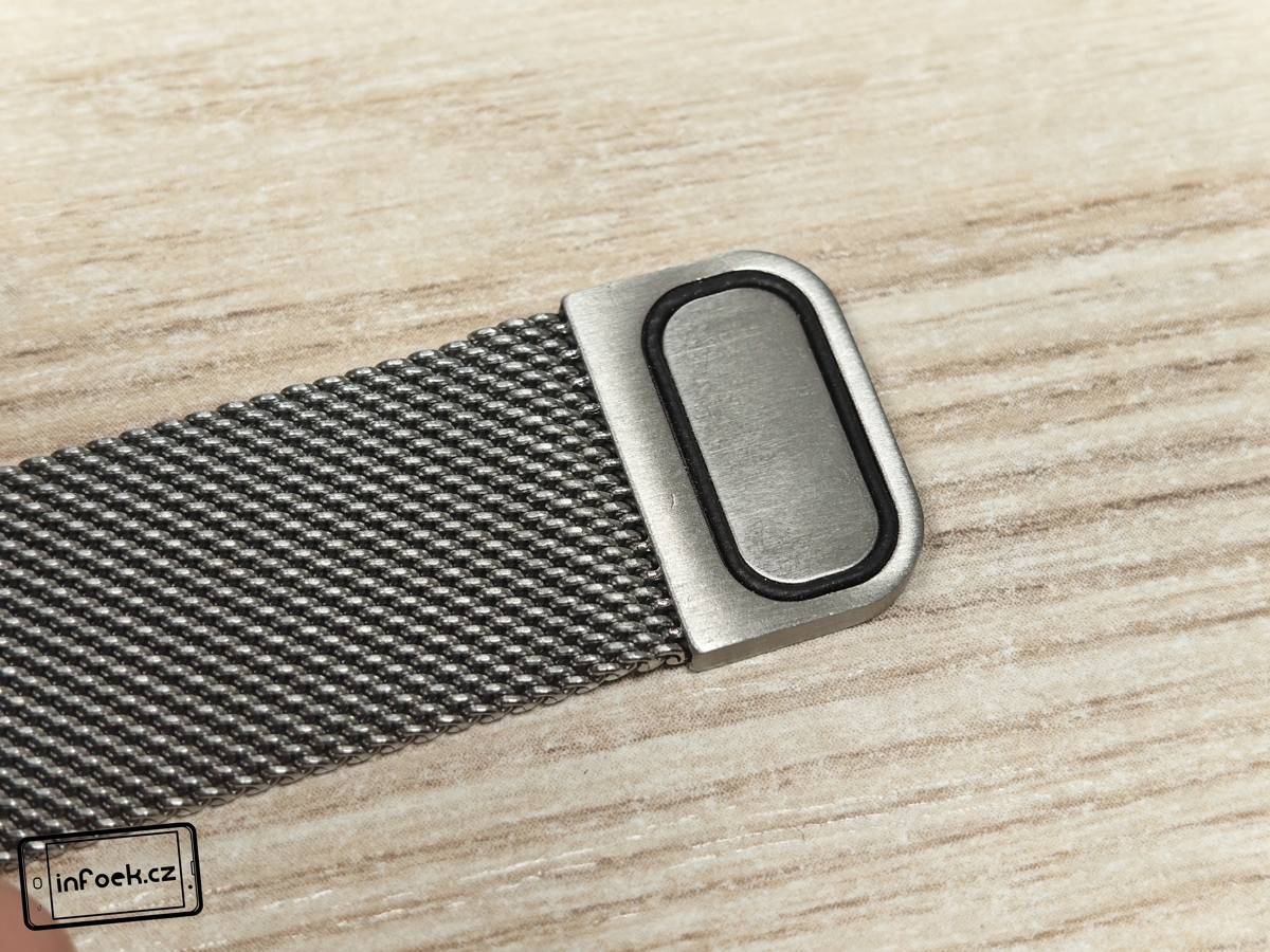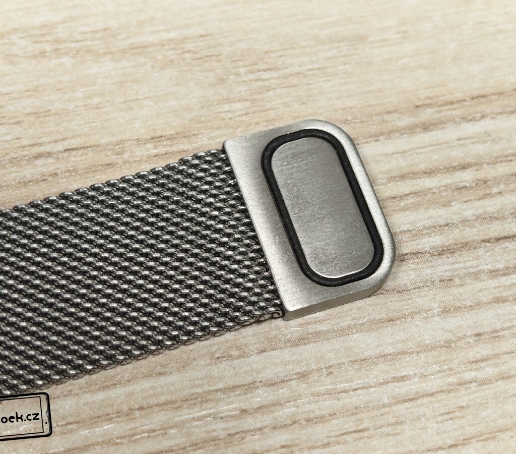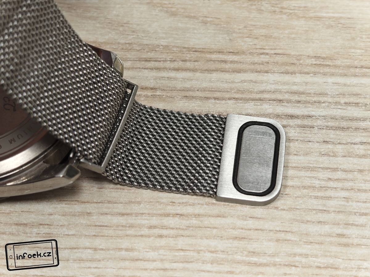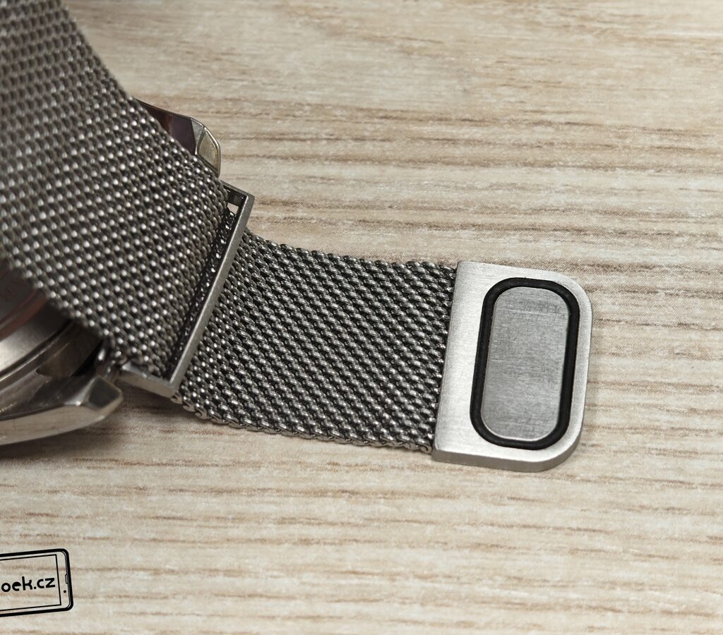 Někoho může zpočátku zaskočit magnetické zapínání, ale v praxi je velmi silné a během spánku či rychlé jízdy na koloběžce nedošlo k odepnutí. I kdyby se to přece jen stalo, hodinky zůstanou na ruce díky provlečenému očku. Toto řešení navíc umožňuje rychlou úpravu velikosti pro různé zápěstí, zatímco u běžných milánských tahů bývá nastavování složitější a často vyžaduje šroubováček či jiný nástroj.