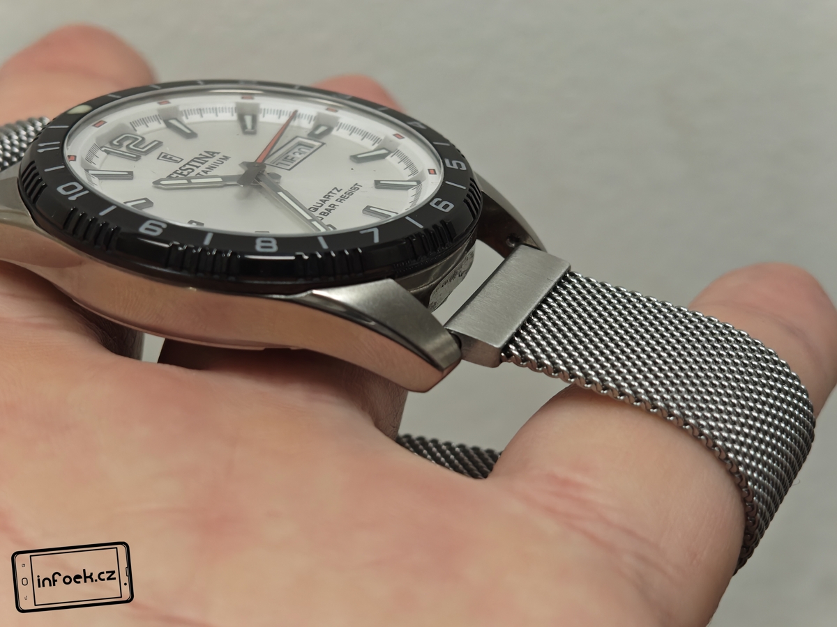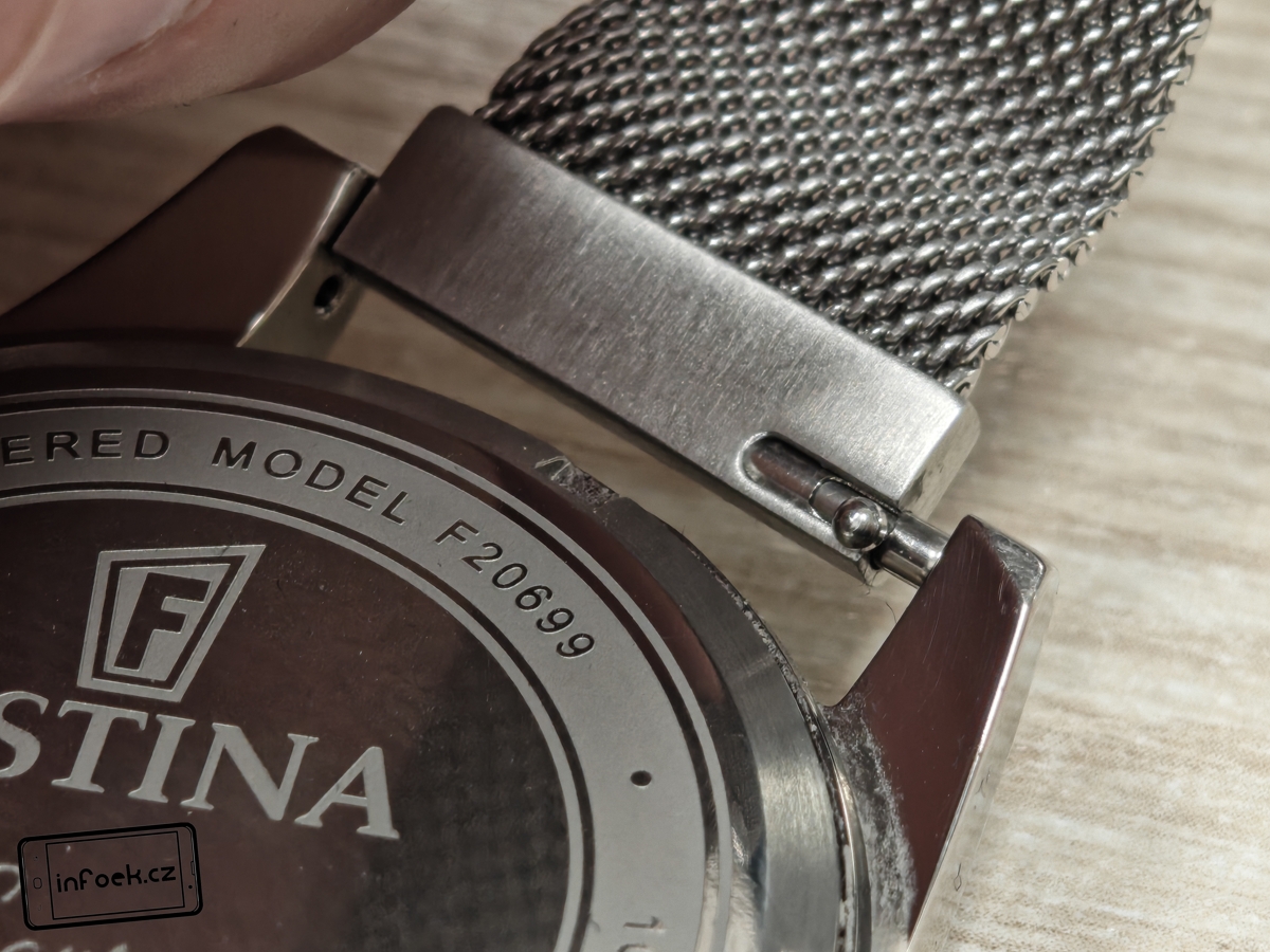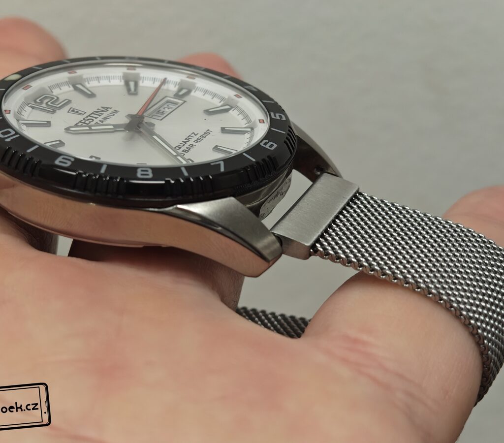 Řemínek se povedl a příjemně se nosí. Občas jsem sice zaznamenal lehké zachycení chlupu, ale pokud vám hodinky dobře sedí a neplandají, tento efekt téměř nehrozí. Zpracování je špičkové a stříbrná ocel krásně ladí s mými titanovými Festinami. K dispozici je i černá varianta nebo provedení žlutého a růžového zlata.