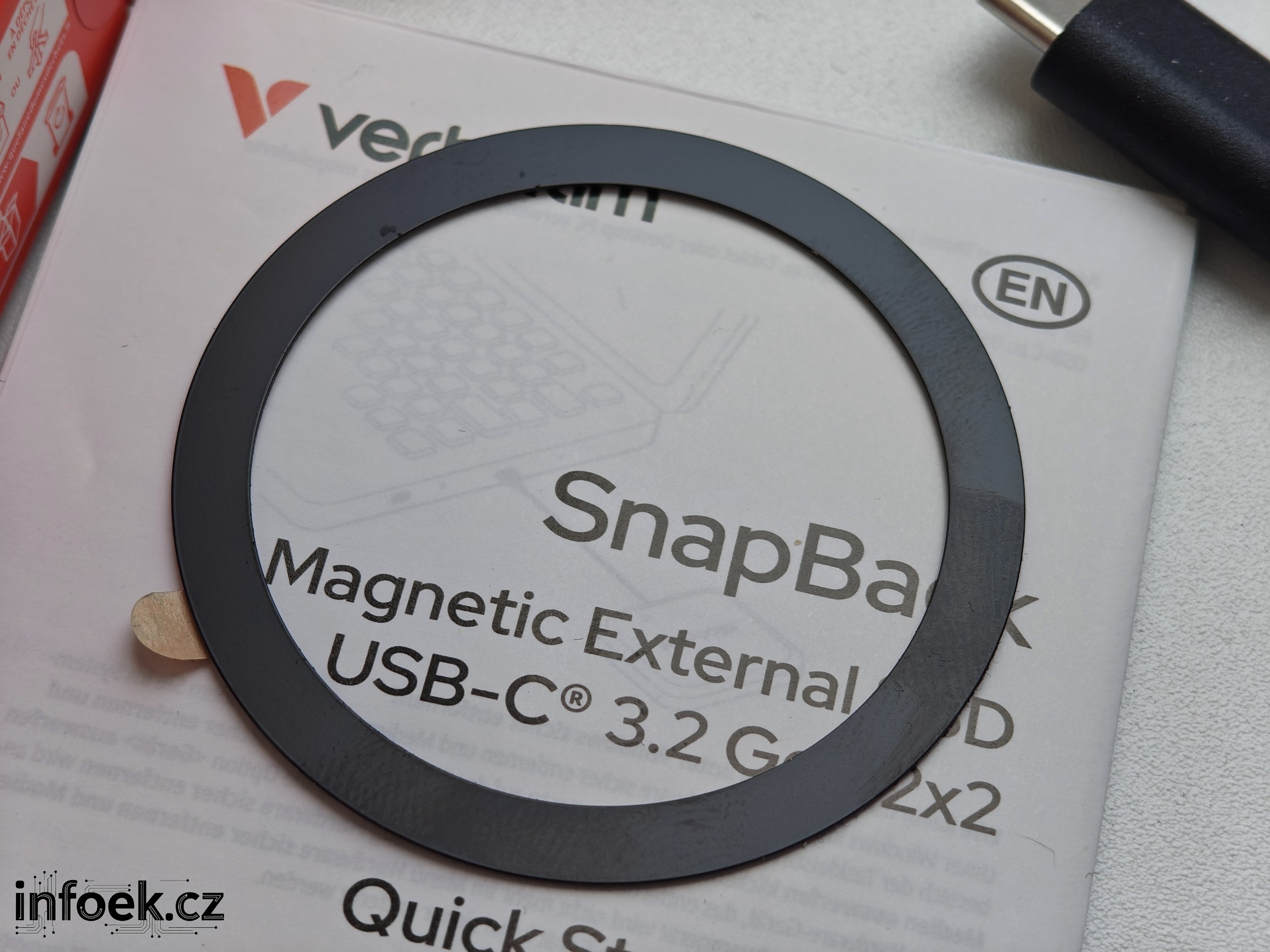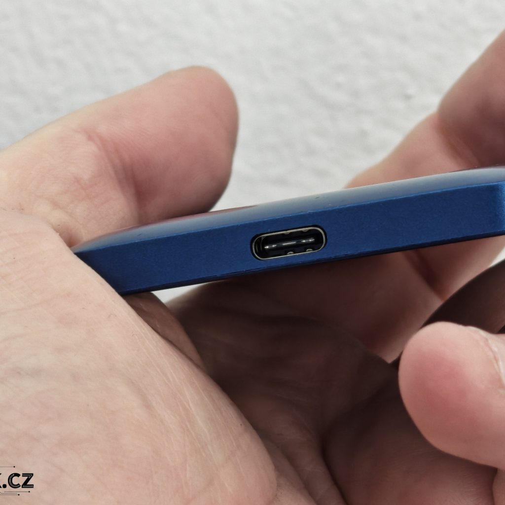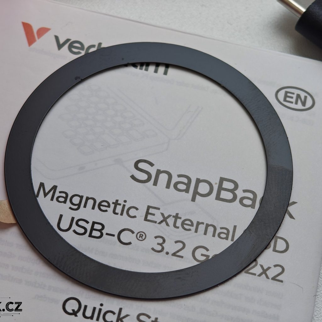 Na disku najdeme samozřejmě USB-C konektor, logo výrobce a diodu. Nemusíte se však obávat, že by dioda nějak moc zářila. Budete vědět, že došlo k připojení disku, ale díky ukrytí diody pod plastovou konstrukcí nebude ve tmě příliš zářit a rušit. Na spodní části najdeme zvýrazněný kroužek a uprostřed logo „V“. Právě zde se nachází skrytý magnetický kroužek, díky kterému můžete disk uchytit na podporované mobily, např. iPhony nebo Huaweie. Jestli nemáte mobil s MagSafe, pak si stačí dokoupit různé ochranné kryty s integrovaným kroužkem nebo použít nalepovací kroužek z prodejního balení.