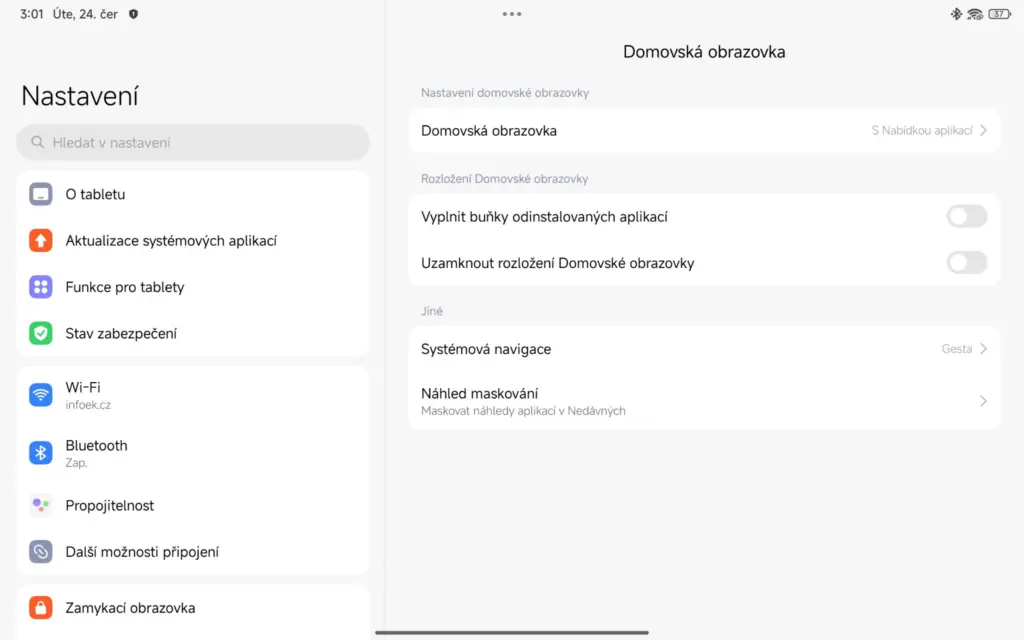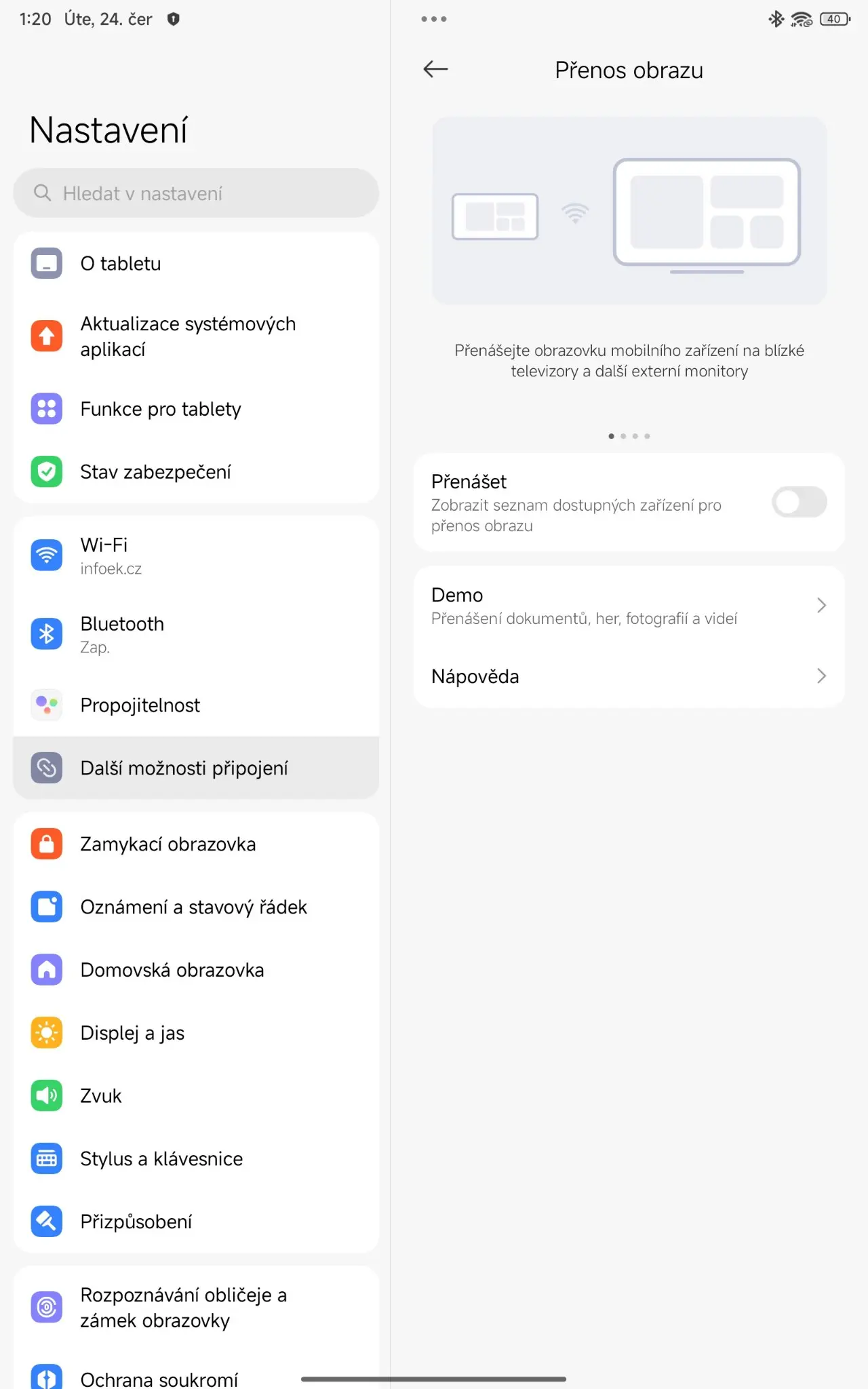 V nastavení ještě můžete najít podporu rychlého přenosu souborů skrze Xiaomi Share nebo Google Quick Charge. Někdo zas rád sáhne po bezdrátovém zrcadlení obrazovky tabletu na televizory či jiná zařízení. Dále tablet lze používat jako přídavný displej k notebooku.
