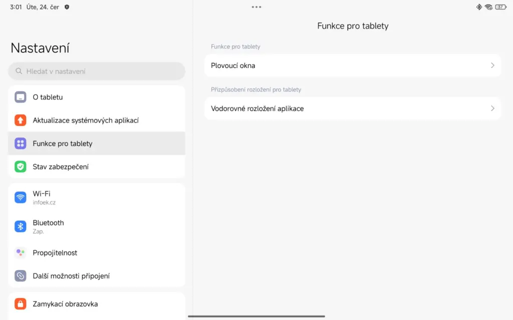 Právě u tabletu oceníte spolehlivá plovoucí okna, možnost rychle spustit jakoukoliv aplikaci v tomto okno, a to jen podržením prstu na její ikoně. Takové okno můžete přenášet na jakékoliv místo po obrazovce, měnit velikost, minimalizovat nebo rozdělit dvě aplikace vedle sebe. To vše je možné i pod možnostmi na horní části jakékoliv aplikace.
