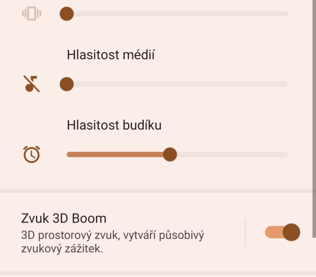 Výrobce se ale činil i po stránce softwaru, v nastavení zvuku se nachází funkce 3D Boom pro vylepšení prostorového zvuku z reproduktorů a sluchátek. K dispozici jsou pak běžné funkce, ale v položce „Nastavení dalších zvuků“ chválím za povolení haptické odezvy a přizpůsobení její síly. To u mobilů v tomto cenovém segmentu rozhodně není obvyklé a haptika funguje skvěle.