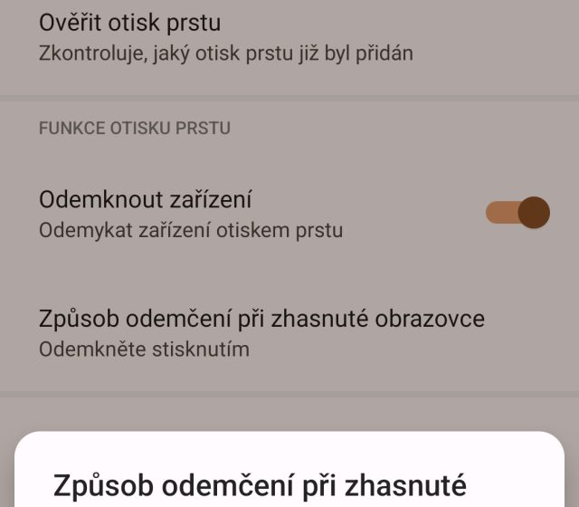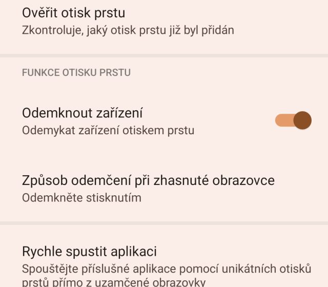 Dražší mobily dnes mají otisky otisků prstů pod displeji, ale já si myslím, že stále je nejlepší umístění na pravém boku mobilu. Výrobce tohoto mobilu umístil čtečku přímo do zamykacího tlačítka, takže na ní snadno dosáhnu palcem pravé roky a ukazováčkem ruky levé. Rychle si na umístění zvyknete a optická čtečka funguje svižně a spolehlivě. Po celou dobu testování jsem se čtečkou neměl žádný problém. V nastavení si můžete vybrat, zda se má mobil odemknout ihned po doteku po čtečce či stisknutím tlačítka.