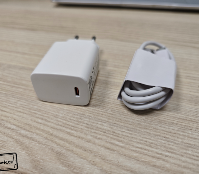 V prodejní krabičce najdeme 33 W nabíjecí adaptér a USB-C na USB-C nabíjecí/datový kabel. Dále najdeme jen sponu pro vysunutí nanoSIM/microSD šuplíku a různé návody.