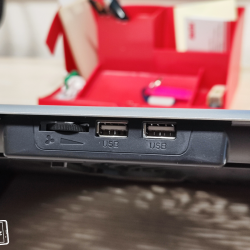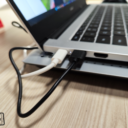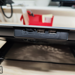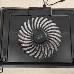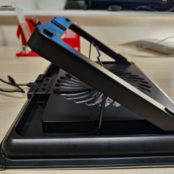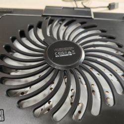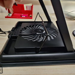 Samozřejmě ventilátor je nutno nějak napájet a do balení výrobce přidává krátký USB-A – USB-A kabel. Ten zapojíte do USB-A konektoru na zadní části stojanu a druhý konec kabelu pak do notebooku či nějakého adaptéru. Pokud kabel zapojíte do notebooku, nemusíte se obávat, že o jeden USB-A konektor např. pro připojení flash disků přijdete. Zadní část má totiž druhý USB-A, do kterého právě můžete připojovat příslušenství a neslouží tedy jen jako napájení zařízení, ale i pro přenos dat. Pak je tam i jakési kolečko pro regulaci rychlosti ventilátoru. Příjemně překvapen jsem tím, že ventilátor na maximální výkon je celkem tichý a při práci vás rušit nebude.