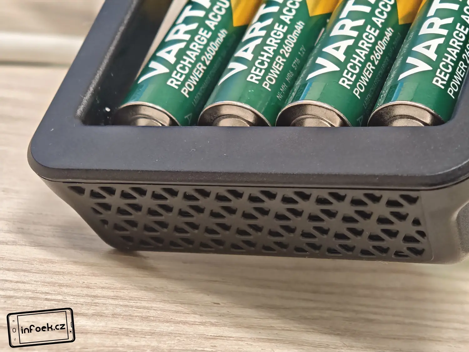 Nabíjení baterií je celkem rychlé a 4x AA baterie o kapacitě 2 100 mAh jsem z nuly do 100 % nabil za přibližně 4 a půl hodiny. Nejpomalejší jsou poslední procenta, což je samozřejmě běžné. Samozřejmě nechybí všechny potřebné ochrany, a to třeba automatické vypnutí nabíjení a ochrana proti přehřátí a zkratu.