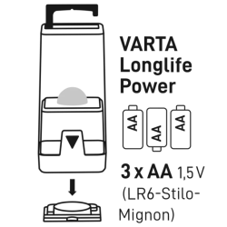 Vrchní průhlednou část (čočku) je možné snadno sundat, přesto drží pevně na svém místě i během přenášení v batohu s dalšími věcmi. Horní i spodní část mají háčky pro možné zavěšení např. na větev. Čelní část na sobě nese logo VARTA a žluté tlačítko pro svit. Vespod se nachází i dvířka, která se sundávají hůře, ale zvládne to každý. Mají totiž i gumové těsnění, aby do konstrukce nevtekla voda. Pod dvířky je místo při tři AA (tužkové baterie).